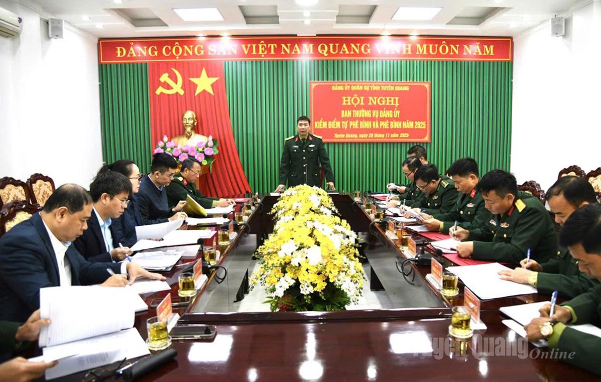 Ngày 28-11, Ban Thường vụ Đảng ủy Quân sự tỉnh tổ chức Hội nghị kiểm điểm tự phê bình và phê bình năm 2025. Đại tá Nguyễn Hoài Nam, Ủy viên BCH Đảng bộ tỉnh, Phó Bí thư Thường trực Đảng ủy Quân sự tỉnh, Chính ủy Bộ CHQS tỉnh chủ trì hội nghị. Dự hội nghị có các đồng chí trong Ban Thường vụ Đảng ủy Quân sự tỉnh, Thủ trưởng Bộ CHQS tỉnh; đại biểu lãnh đạo Ủy ban kiểm tra Tỉnh ủy, Ban Tổ chức, Ban Nội chính và Văn phòng Tỉnh ủy.