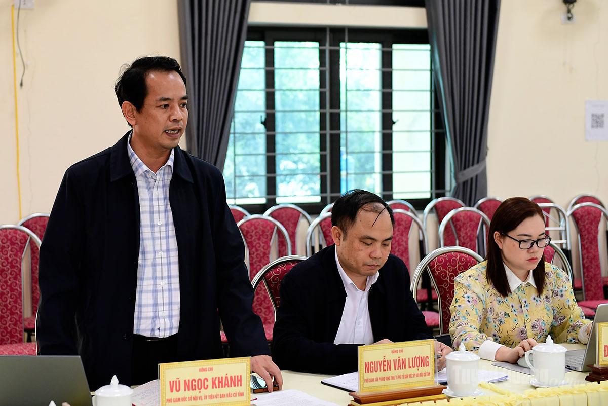 | Đồng chí Vũ Ngọc Khánh, Phó Giám đốc Sở Nội vụ, Ủy viên Ủy ban Bầu cử tỉnh phát biểu tại buổi làm việc với xã Xuân Vân. |