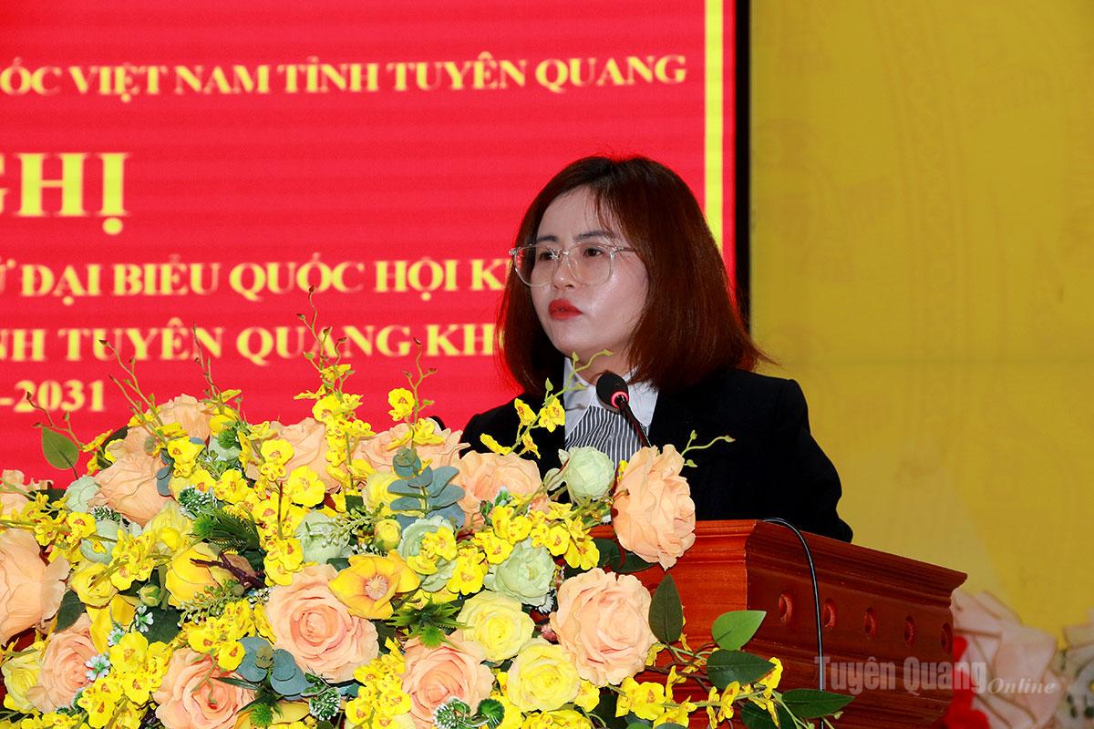 Đại diện Ủy ban MTTQ Việt Nam tỉnh đã lần lượt giới thiệu tóm tắt tiểu sử, quá trình công tác của các ứng cử viên đại biểu Quốc hội tỉnh gồm các ông, bà: Ma Thị Thúy, Ủy viên Ban Chấp hành Đảng bộ tỉnh, Ủy viên Ban Chấp hành Đảng bộ các cơ quan Đảng tỉnh, Phó Trưởng đoàn đại biểu Quốc hội hoạt động chuyên trách tỉnh Tuyên Quang, Ủy viên Hội đồng Dân tộc của Quốc hội; Nguyễn Việt Hà, Bí thư Đảng ủy, Giám đốc Ngân hàng Nông nghiệp và Phát triển nông thôn Việt Nam - Chi nhánh Tuyên Quang, Ủy viên Ủy ban Công tác đại biểu Quốc hội khóa XV, Ủy viên Ban Thường vụ Hội Liên hiệp Phụ nữ tỉnh Tuyên Quang; Hoàng Hồng Trường, Bí thư Chi bộ, Giám đốc Trung tâm Khuyến nông tỉnh; Bàn Văn Trọng, Phó Bí thư Thường trực Đảng ủy, Chủ tịch Hội đồng nhân dân xã Kim Bình.