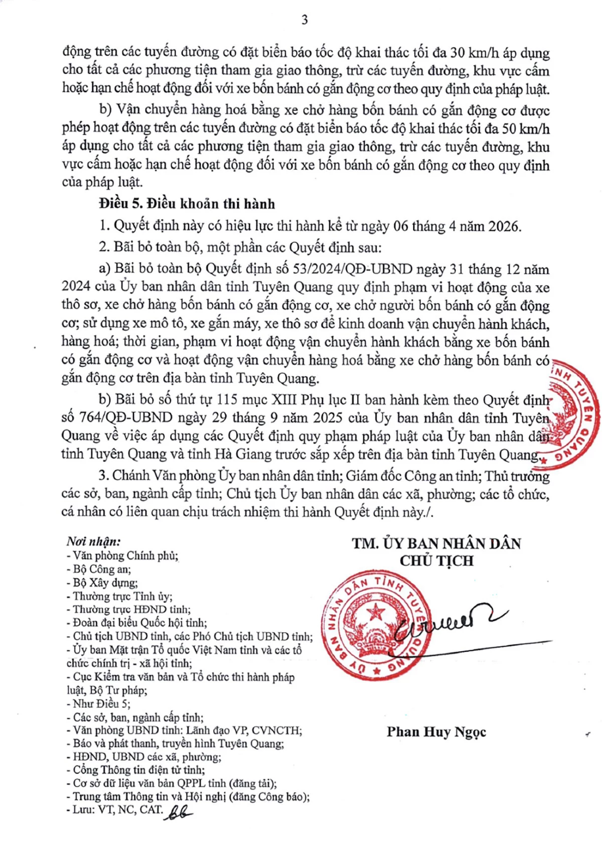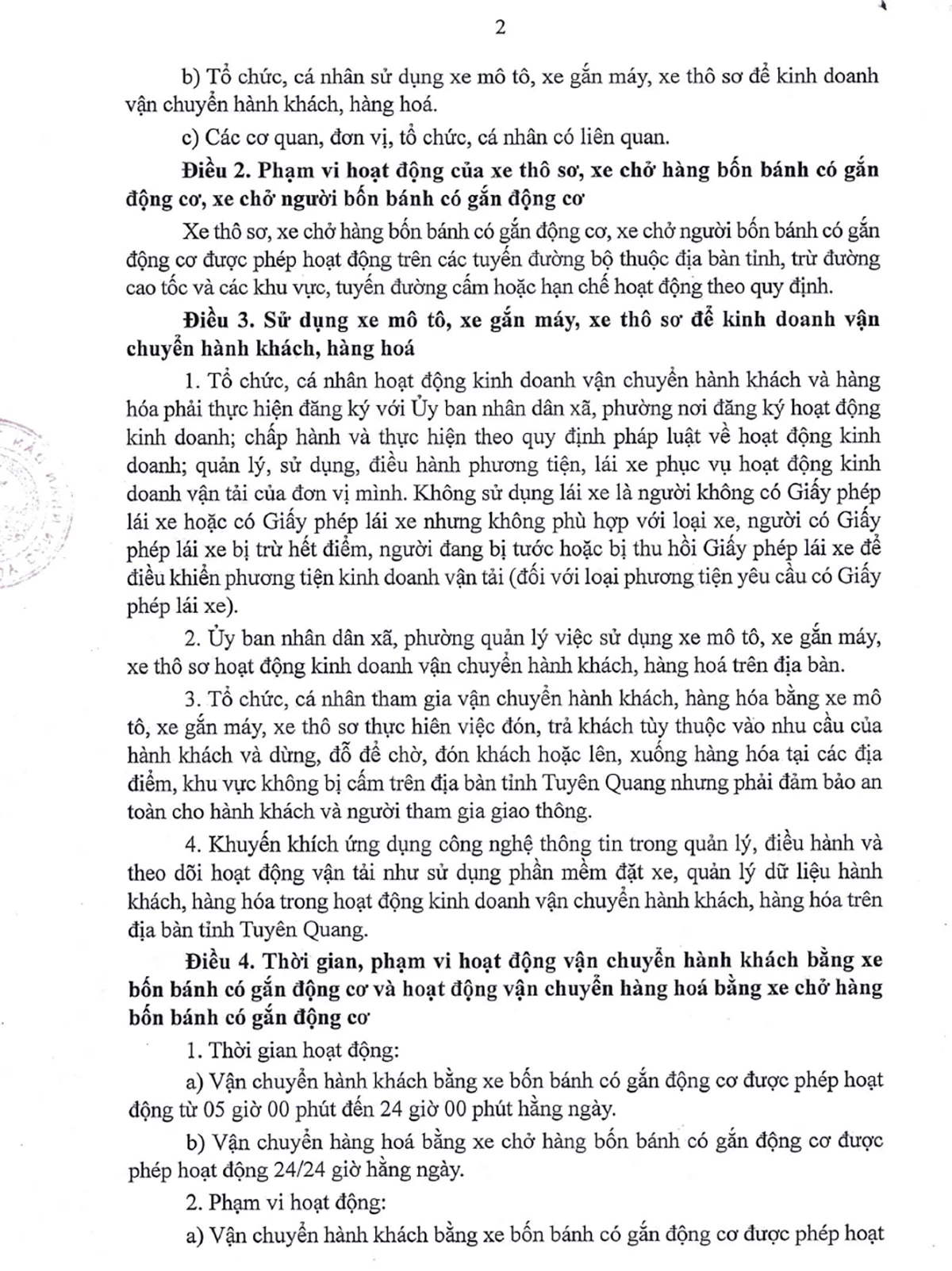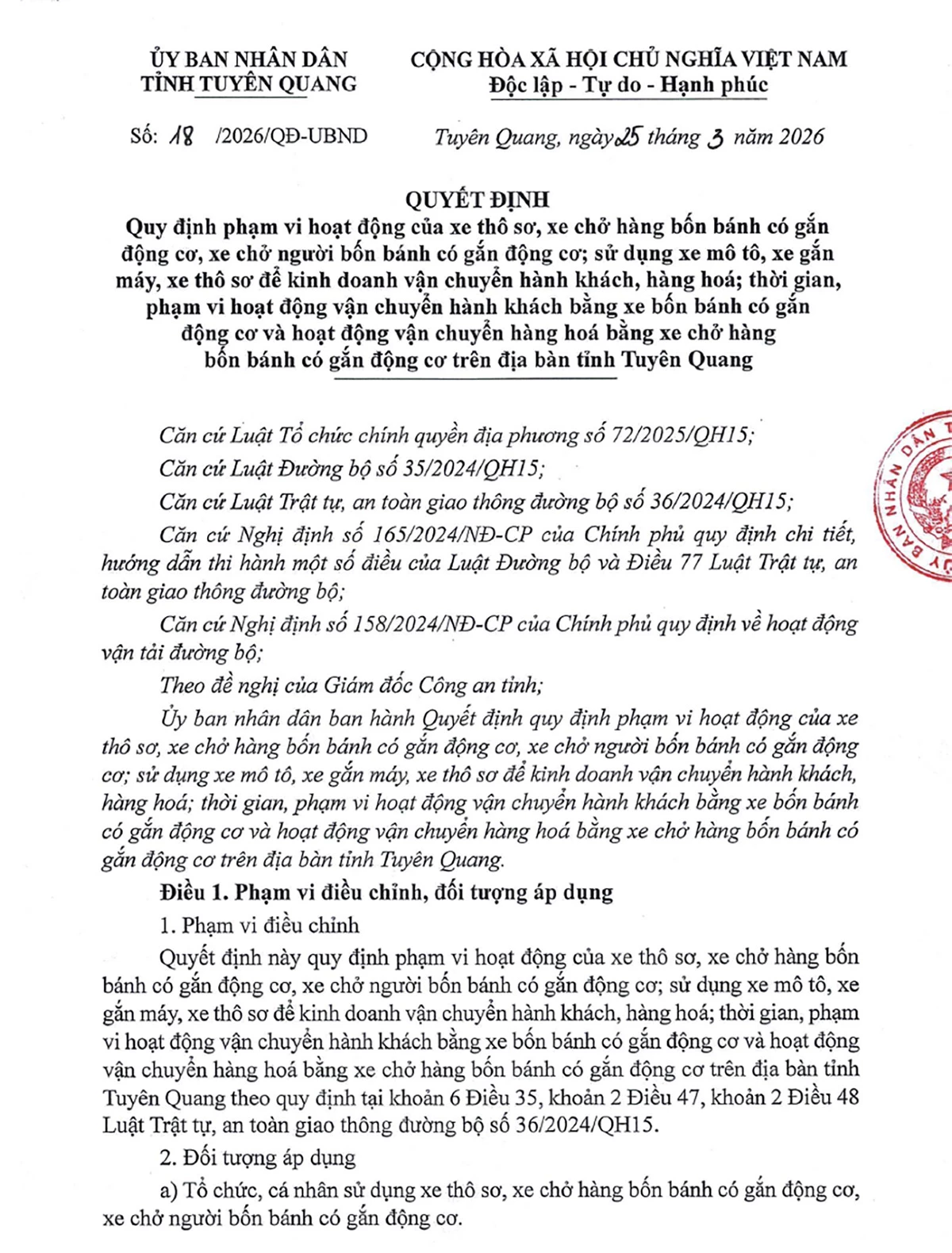 UBND tỉnh Tuyên Quang vừa ban hành Quyết định số 18/2026/QĐ-UBND quy định chi tiết về phạm vi, thời gian hoạt động và đối tượng áp dụng đối với các loại xe thô sơ, xe chở hàng, chở người 4 bánh có gắn động cơ trên địa bàn tỉnh. Quy định này nhằm tăng cường quản lý hoạt động vận tải và đảm bảo trật tự, an toàn giao thông theo các luật mới nhất.
