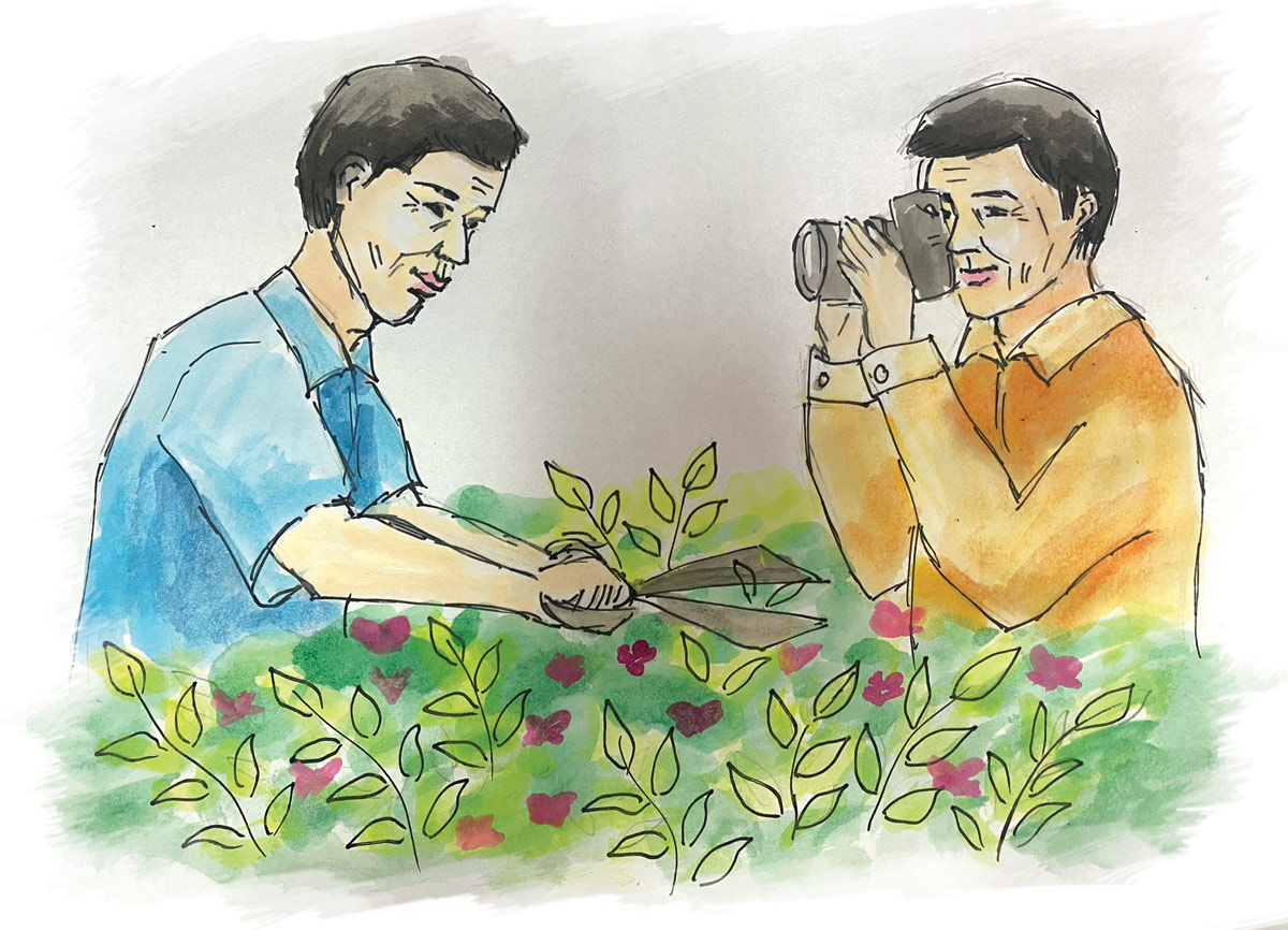 Ông Lường xin phép được chụp ảnh người nông dân đang chăm sóc hoa. Chủ vườn hoa từ tốn:
