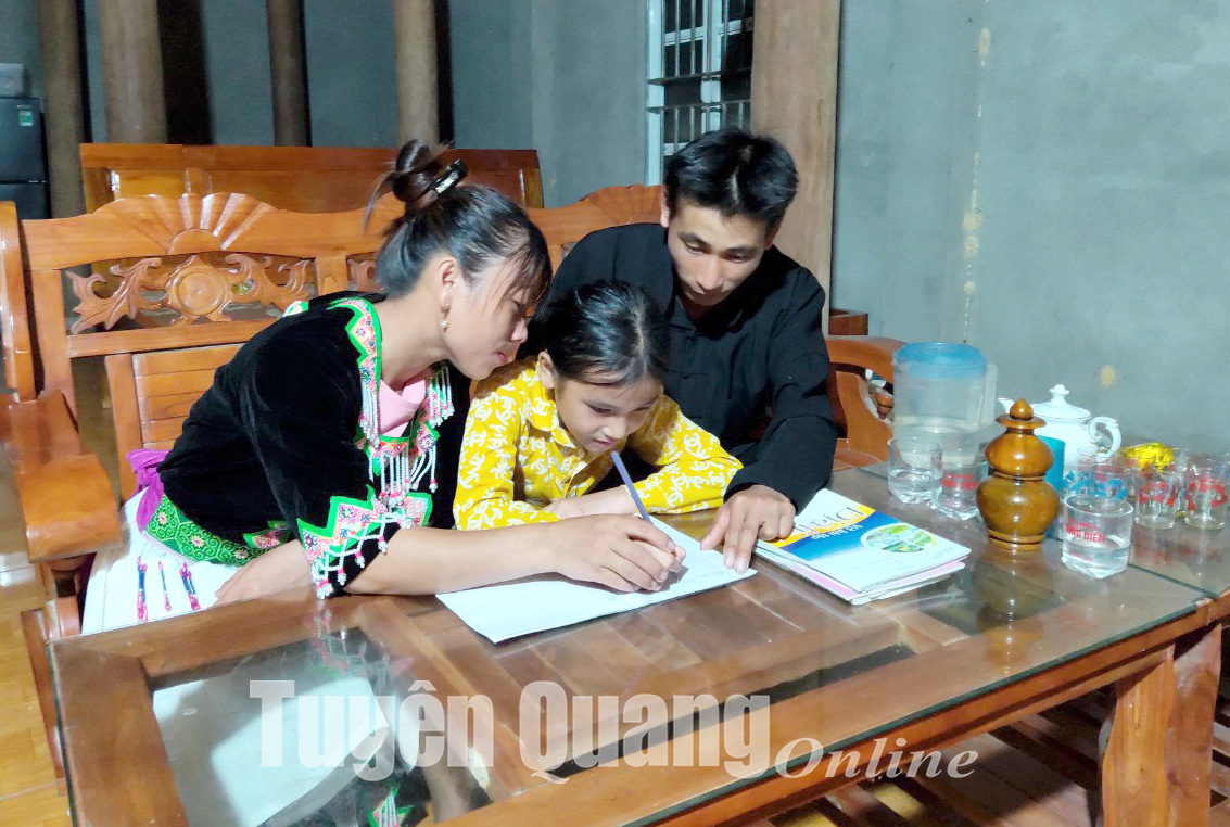 Vợ chồng anh Lò Xuân Bình, người Mông, thôn Lũng Giềng, xã Xuân Lập (Lâm Bình) dạy con học vẽ trong dịp hè.