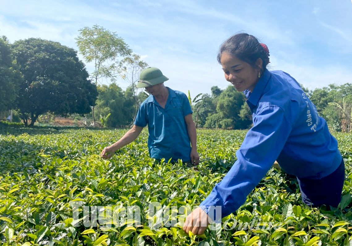 Vợ chồng chị Hoàng Thị Yến, thôn Yên Thái, xã Hoàng Khai (Yên Sơn) cùng giúp nhau chăm sóc chè.