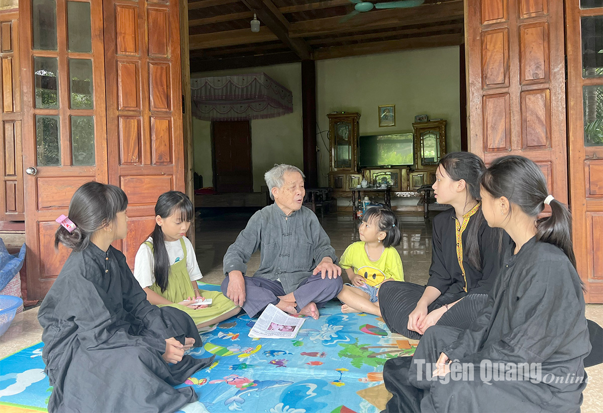 Cụ Thạch Kim Tứ, xã Trung Sơn (Yên Sơn) đọc và giải thích ý nghĩa những ca dao tục ngữ cho các cháu nhỏ.