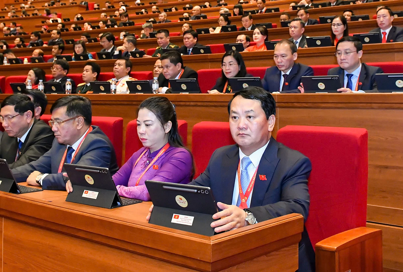 | Bí thư Tỉnh ủy Hầu A Lềnh, Phó Bí thư Thường trực Tỉnh ủy Lê Thị Kim Dung và các đại biểu đoàn Tuyên Quang tham dự phiên trù bị Đại hội. |