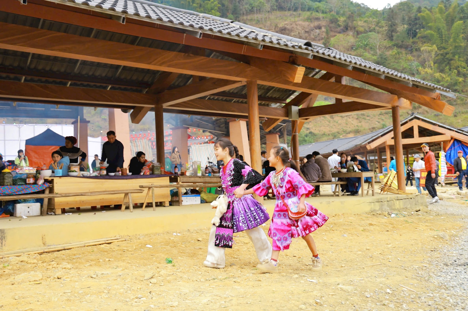 | Những cô bé người Mông trong trang phục truyền thống rực rỡ sắc màu tung tăng xuống chợ và đi hội xuân. |