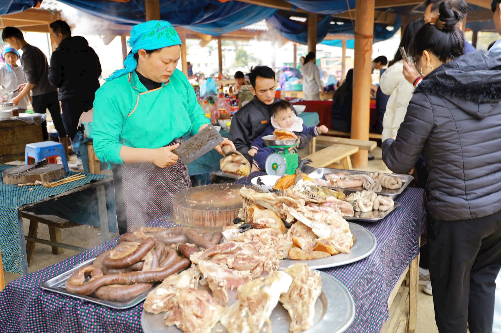 | Một quán bán hàng ăn phục vụ khách tại chợ phiên Cán Cấu. |