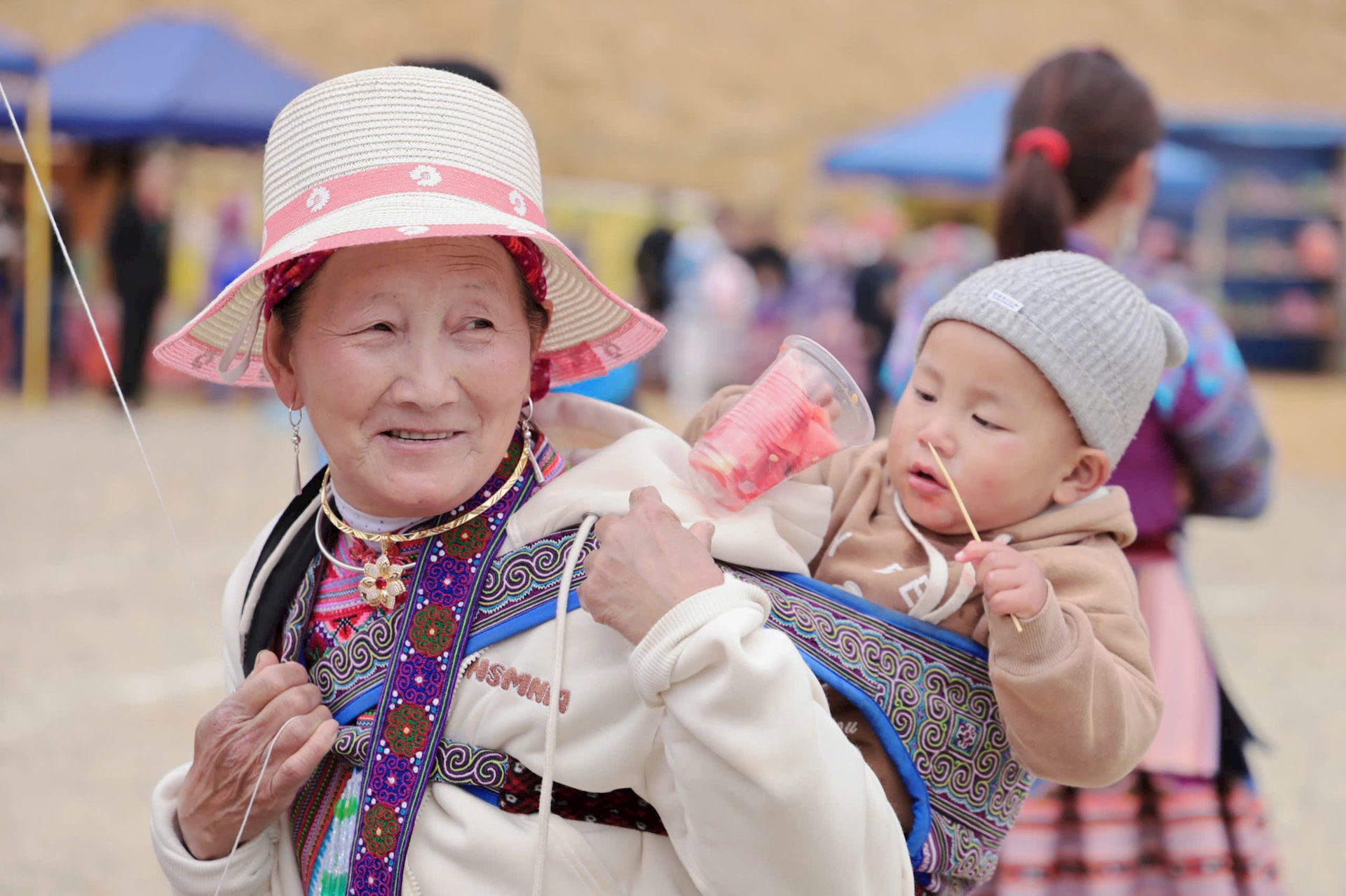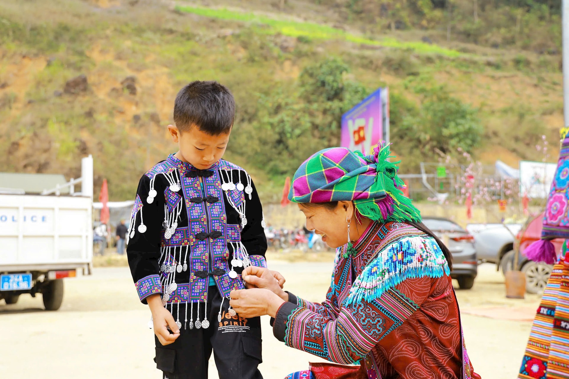 | Từ sáng sớm, những người phụ nữ dân tộc Mông đã chọn cho mình những bộ váy áo đẹp nhất cùng cả gia đình xuống chợ Cán Cấu và vui lễ hội Gầu Tào. |