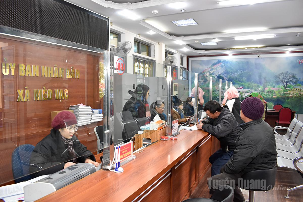 | Cán bộ xã Mèo Vạc giải quyết thủ tục hành chính cho người dân. |