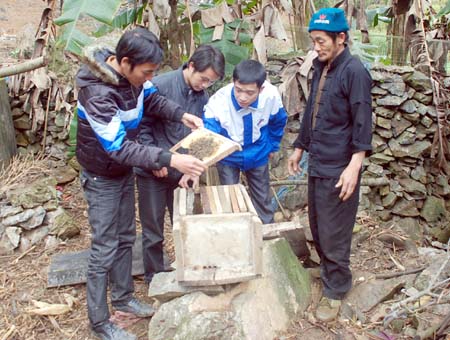 Cán bộ Đoàn Thanh niên huyện, xã xuống thăm mô hình nuôi ong lấy mật cho thu nhập cao của gia đình anh Tráng Mí Pó. |