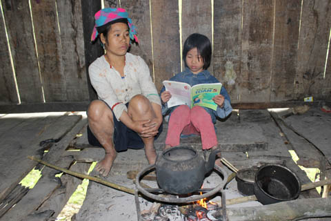 Mất gần 20 phút, chúng tôi mới đến được thôn Nậm Ban vì con đường vào thôn ngoằn ngoèo khó đi. Gia đình em Vàng Thị Tuyến (sinh năm 2006) nằm trên sườn đồi vắng vẻ. Tuyến là học sinh lớp 3A và chị là Vàng Thị Xuyến học lớp 5C, Trường PTDT bán trú Tiểu học xã Nậm Ban. Cả hai em khi sinh ra trong một gia đình có hoàn cảnh khá đặc biệt, bố Vàng A Pênh, sinh năm 1978, còn mẹ là Nùng Thị Siến sinh năm 1975 đều bị thiểu năng trí tuệ. Gia đình nghèo, căn nhà sàn đang ở được xã hỗ trợ xây dựng theo chương trình xóa nhà tạm năm 2009. Tài sản trong nhà chỉ có khoảng 5 tạ thóc, mấy cái bát, mấy cái nồi, giường ngủ cũng không có. Tất cả bốn thành viên trong gia đình phải trải chiếu nằm ra sàn nhà ngủ trong căn buồng chật hẹp.