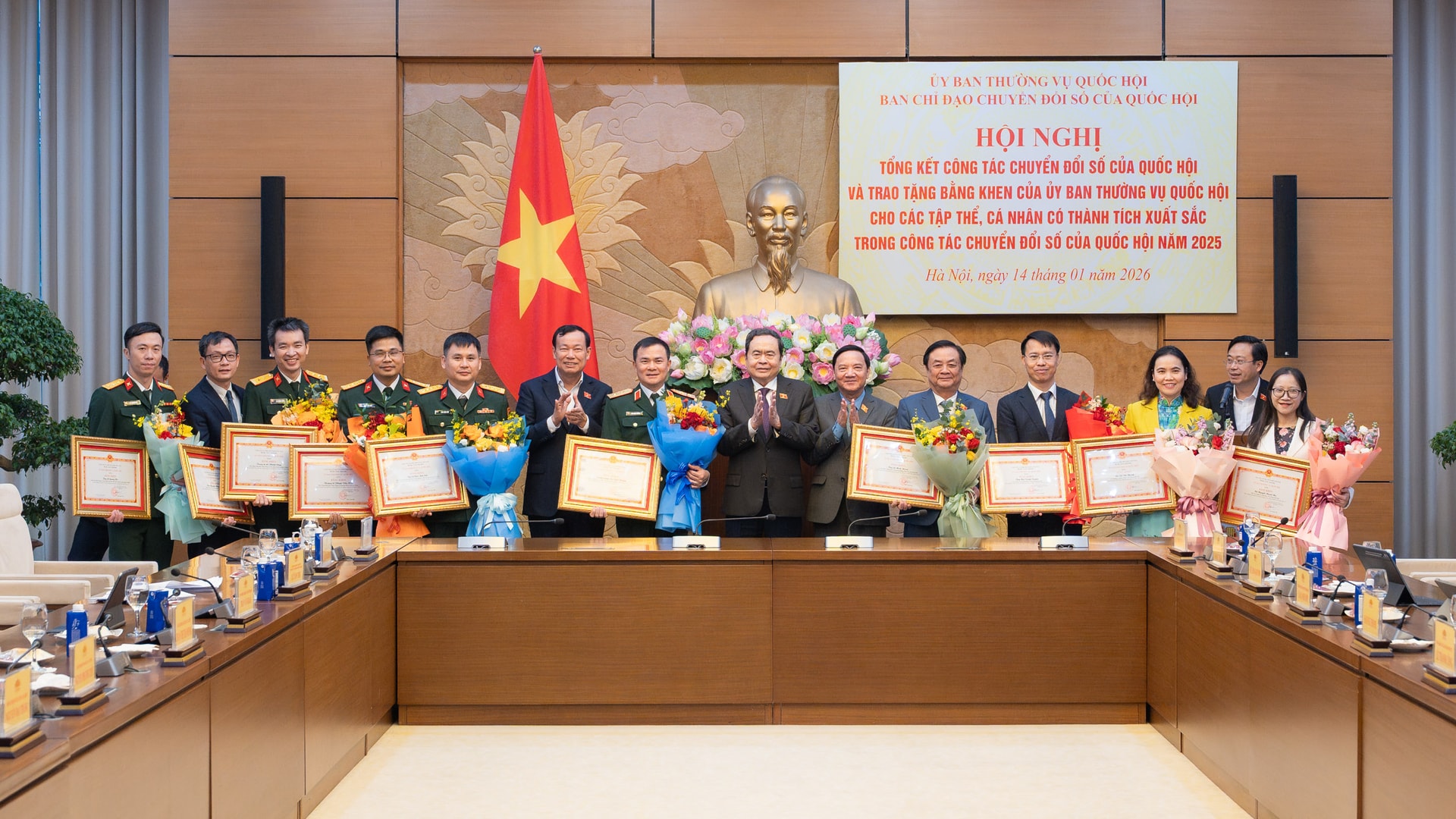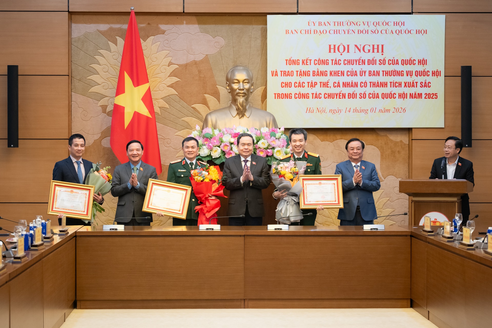 Tại buổi lễ, Chủ tịch Quốc hội Trần Thanh Mẫn đã trao Bằng khen của Ủy ban Thường vụ Quốc hội tặng 3 tập thể và 11 cá nhân có thành tích xuất sắc trong công tác chuyển đổi số của Quốc hội năm 2025.