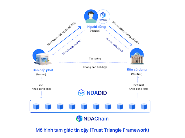 | Tam giác tin cậy trong mô hình quản lý danh tính tự chủ của NDAKey. |