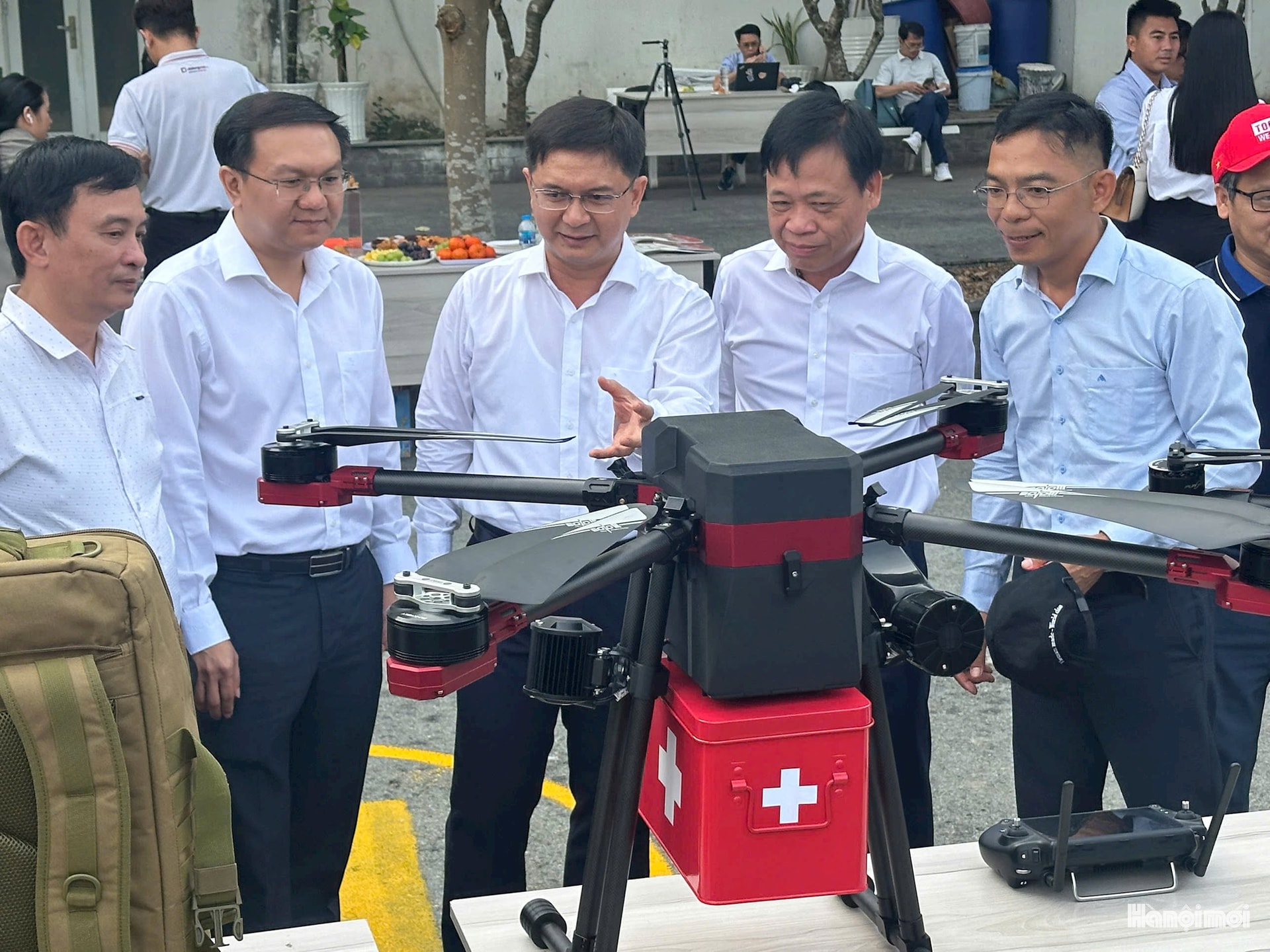 | Lãnh đạo thành phố Hồ Chí Minh tham quan thiết bị bay không người lái (UAV) tại buổi thử nghiệm bay. Ảnh: M.Tuấn |