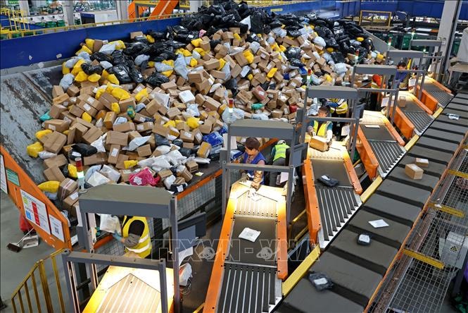 | Nhân viên phân loại các đơn hàng tại trung tâm logistics ở Sơn Đông, Trung Quốc. Ảnh: THX/TTXVN |