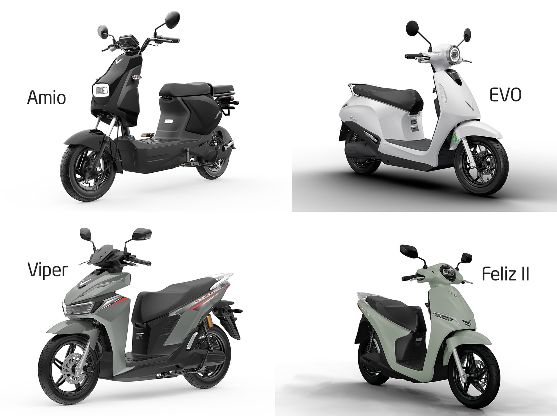 Hai mẫu xe đổi pin còn lại là Feliz II và Evo, với thiết kế tương tự thế hệ trước. Cụ thể, Feliz II được trang bị mô tơ công suất lớn nhất 3.000W tương tự Viper, trong khi Evo được trang bị mô tơ công suất lớn nhất 2.450W. Cả hai đều hỗ trợ tốc độ tối đa lên tới 70 km/giờ, riêng Evo sẽ có thêm phiên bản Evo Lite được giới hạn tốc độ tối đa dưới 50 km/giờ (không yêu cầu bằng lái).