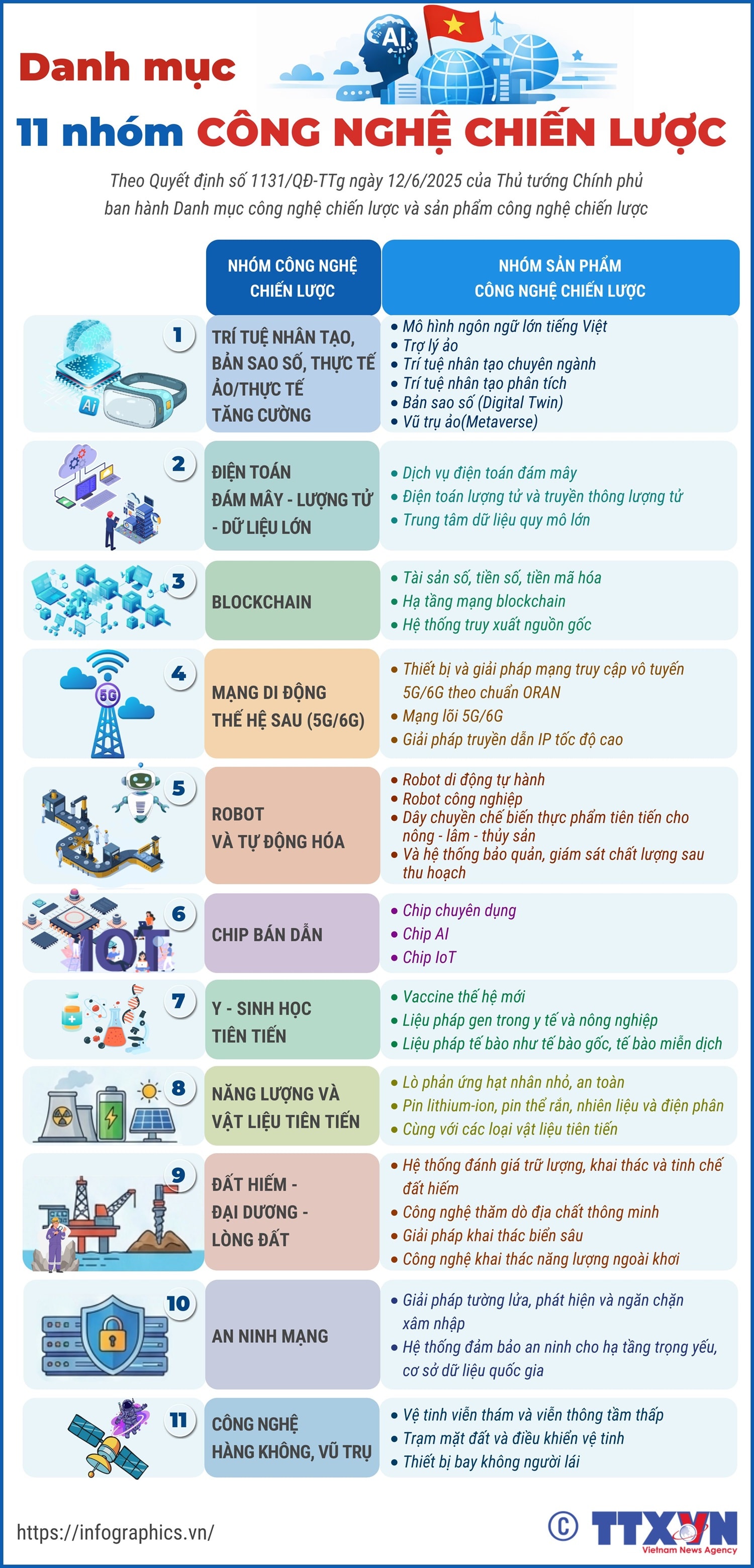 Tại Quyết định số 1131/QĐ-TTg ngày 12-6-2025, Thủ tướng đã ban hành danh mục gồm 11 nhóm công nghệ chiến lược và 35 nhóm sản phẩm công nghệ chiến lược. Nhóm công nghệ trí tuệ nhân tạo, bản sao số, thực tế ảo/thực tế tăng cường được xếp ở vị trí đầu tiên trong Danh mục, tiếp theo là các nhóm công nghệ: Điện toán đám mây, lượng tử, dữ liệu lớn; Blockchain; Mạng di động thế hệ sau (5G/6G); Robot và tự động hóa; Chip bán dẫn…