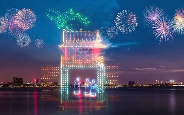 | Trình diễn ánh sáng bằng công nghệ Drone tại không gian di sản Tây Hồ. Ảnh: Như Ý |
