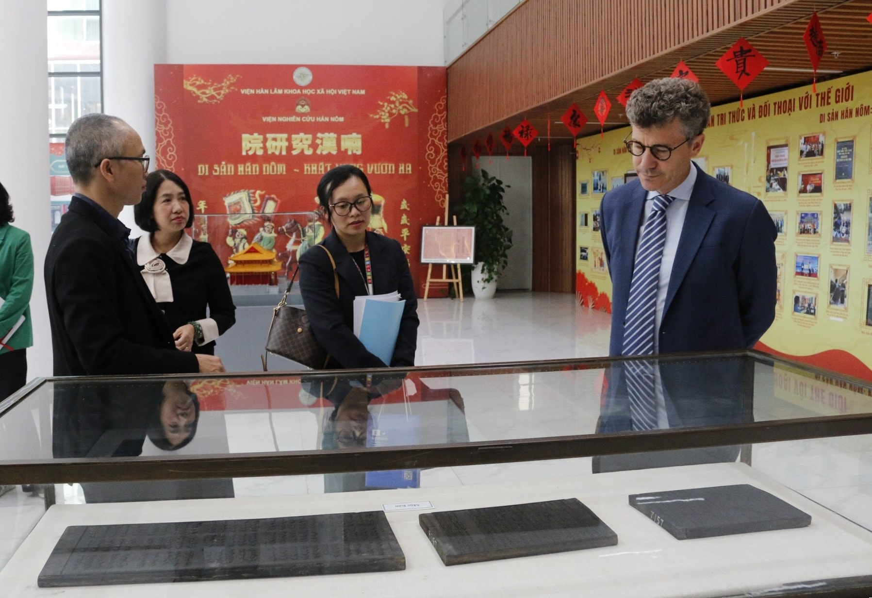 | Ngài Jonathan Baker, Trưởng đại diện Văn phòng UNESCO tại Hà Nội tham quan không gian trưng bày về Hán Nôm tại Viện Hàn lâm Khoa học xã hội Việt Nam. Ảnh: PV |