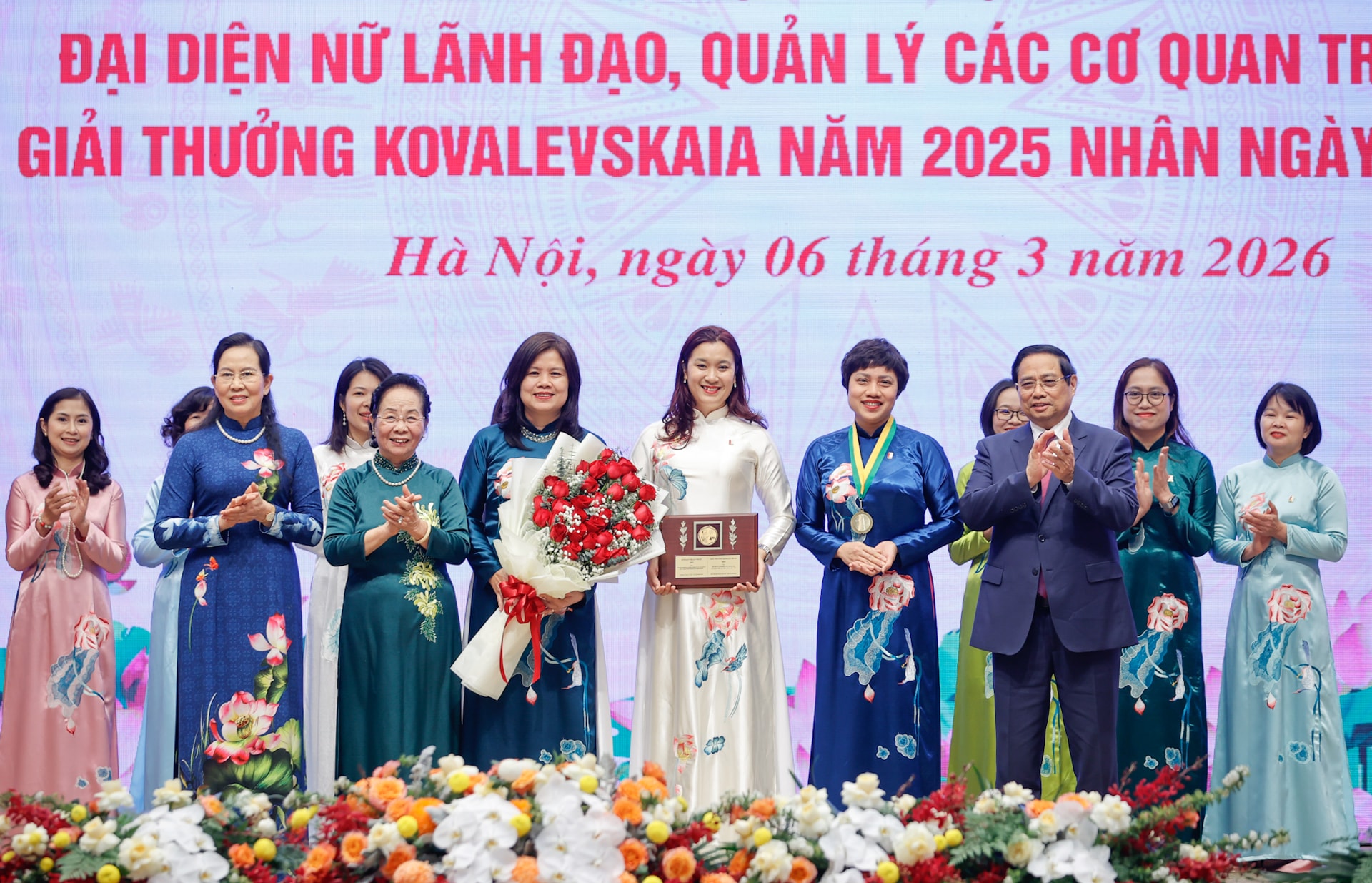 | Thủ tướng Phạm Minh Chính trao giải thưởng Kovalevskaia năm 2025 cho tập thể các nhà khoa học nữ Đại học Bách khoa Hà Nội với cụm công trình "Ứng dụng xúc tác sinh học nâng cao giá trị nông sản Việt". Ảnh: Nhật Bắc |