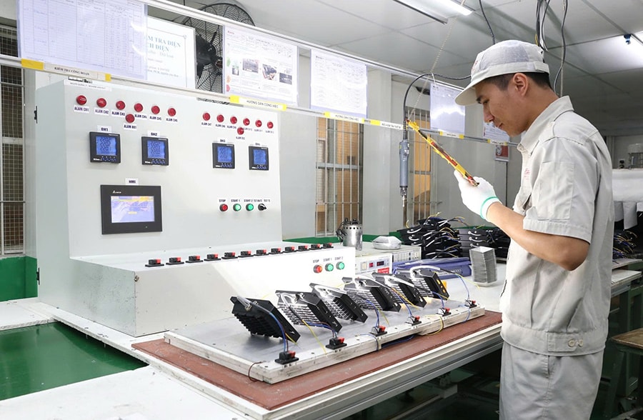 | Kiểm tra thông số đèn chiếu sáng ngoài trời tại Công ty cổ phần Bóng đèn phích nước Rạng Đông. Ảnh: Quỳnh Trang |