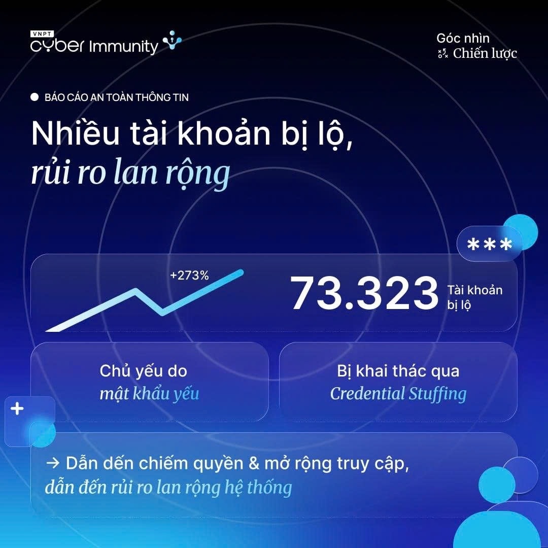 Thông tin từ Trung tâm An toàn thông tin VNPT (VNPT Cyber Immunity) thuộc Tập đoàn VNPT, trong tháng 3-2026 hệ thống giám sát VNPT ghi nhận 73.323 tài khoản lộ lọt từ các hệ thống được giám sát đang được công khai, rao bán trên không gian mạng.