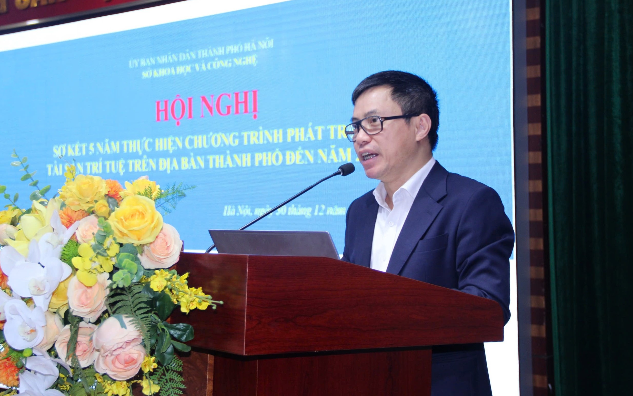 | Ông Lê Huy Anh, Phó Cục trưởng Cục Sở hữu trí tuệ (Bộ Khoa học và Công nghệ) phát biểu tại Hội nghị sơ kết 5 năm thực hiện Chương trình Phát triển tài sản trí tuệ trên địa bàn Hà Nội đến năm 2030, tháng 12-2025. Ảnh PV |
