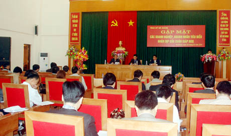 Tại buổi gặp mặt, Bí thư Tỉnh ủy Triệu Tài Vinh có bài phát biểu chào mừng và thông báo về một số chủ trương, định hướng của tỉnh trong năm 2014 và những năm tiếp theo. Đồng chí Bí thư chúc các doanh nghiệp, doanh nhân tiêu biểu tại buổi gặp mặt và các doanh nghiệp toàn tỉnh năm mới Giáp Ngọ “Mã đáo thành công; khai xuân, khai trí, khai nguồn, giành nhiều thắng lợi” với niềm tin “Doanh nghiệp phát tài – Hà Giang phát triển”. Trong bối cảnh nền kinh tế khó khăn nhưng nhiều doanh nghiệp, doanh nhân của tỉnh, nhất là những người có tâm, có trí, có tầm vẫn đứng vững, phát triển. Bên cạnh việc đẩy mạnh hoạt động sản xuất, kinh doanh, thực hiện công tác an sinh xã hội, trong những năm gần đây, nhiều doanh nghiệp quan tâm làm tốt công tác xây dựng, phát triển Đảng, đó là định hướng, xu thế chính trị tích cực, càng khẳng định vai trò lãnh đạo của Đảng với giai cấp công nhân trong tình hình mới. Đồng chí Triệu Tài Vinh ghi nhận, biểu dương và đánh giá cao sự cố gắng và những đóng góp quan trọng của các doanh nghiệp, doanh nhân vào nền kinh tế và sự nghiệp phát triển đi lên của tỉnh nhà. Thông tin tình hình, kết quả nổi bật của tỉnh trong năm 2013 và một số chủ trương, định hướng của T.Ư, của tỉnh về phát triển kinh tế, xã hội năm 2014, Bí thư Tỉnh ủy nhấn mạnh, tỉnh tiếp tục chú trọng chỉ đạo có trọng tâm, trọng điểm và xem xét, cho chủ trương đối với các chương trình, đề án phát triển kinh tế xã hội của tỉnh. Trong đó, tập trung thực hiện một số lĩnh vực cụ thể như: Thu hút đầu tư vào các lĩnh vực công nghiệp có tiềm năng của tỉnh như khoáng sản, thuỷ điện; xây dựng kết cấu hạ tầng Khu Công nghiệp Bình Vàng giai đoạn II; khuyến khích đầu tư phát triển công nghiệp chế biến, phát triển thủ công nghiệp gắn với xây dựng các làng nghề truyền thống, ngành nghề mới ở nông thôn. Bên cạnh đó, huy động nguồn lực đầu tư để thực hiện các dự án quy tụ, ổn định dân cư, gắn với phát triển kinh tế biên mậu, phát triển các cặp chợ biên giới ở các điểm lối mở, cửa khẩu trên tuyến biên giới; khuyến khích các doanh nghiệp phát triển hoạt động dịch vụ, xuất nhập khẩu tại các cửa khẩu, lối mở có điều kiện. Đặc biệt, tỉnh khuyến khích, hỗ trợ các doanh nghiệp mở rộng hoạt động sản xuất kinh doanh, phát triển các mô hình sản xuất, chế biến nông lâm sản, thực phẩm, phát triển kinh tế đồi rừng, cây dược liệu trên địa bàn theo hướng hàng hoá, xây dựng thương hiệu sản phẩm, thu mua sản phẩm đầu ra cho nông dân; đẩy mạnh xử lý các công trình chậm tiến độ, khắc phục tình trạng nợ đọng trong xây dựng cơ bản; tập trung cải thiện môi trường đầu tư, huy động, quản lý, sử dụng hiệu quả nguồn vốn ODA, các nguồn lực ngoài nhà nước cho đầu tư phát triển hệ thống đường, điện, hạ tầng đô thị, các công trình trọng điểm, cấp bách…