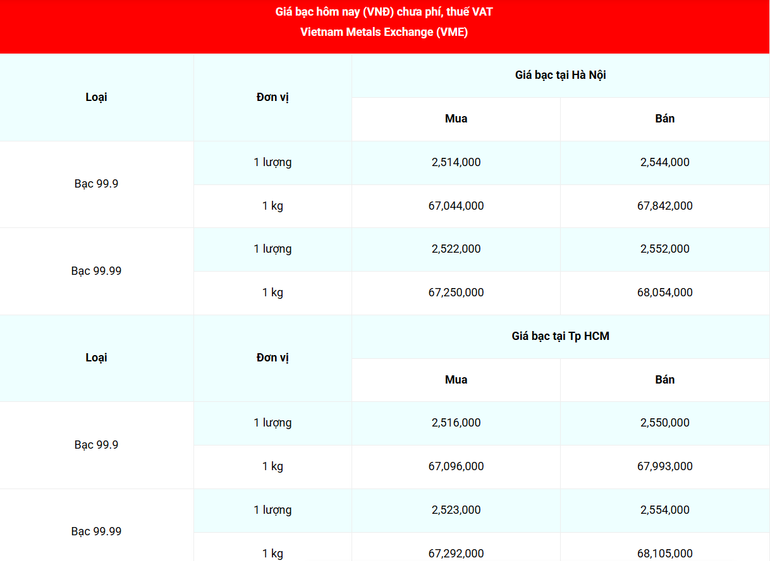 Cụ thể, tại thời điểm 10 giờ 30 phút sáng 6/1, theo Vietnam Metals Exchange (VME), giá bạc 99.99 (chưa phí, thuế VAT) tại Hà Nội niêm yết tại mức 2.522.000 đồng/lượng (mua vào) và 2.552.000 đồng/lượng (bán ra), chênh lệch 2 chiều mua-bán ở mức 30.000 đồng/lượng.