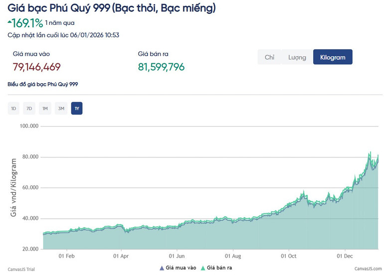 | Giá bạc Phú Quý 999 tăng 169,1% trong 1 năm qua. |