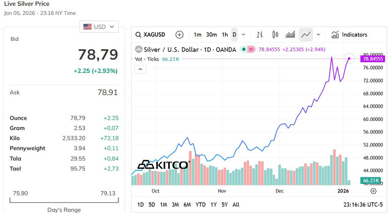 Tại thị trường thế giới, theo kitco.com, tính đến 11 giờ 15 phút sáng 6/1 (giờ Việt Nam), giá bạc bật tăng mạnh, giao dịch quanh mốc 78,7 USD/ounce, tăng 2,93% so kết phiên trước đó. Biên độ giao dịch trong ngày từ 75,9 đến 79,13 USD/ounce.