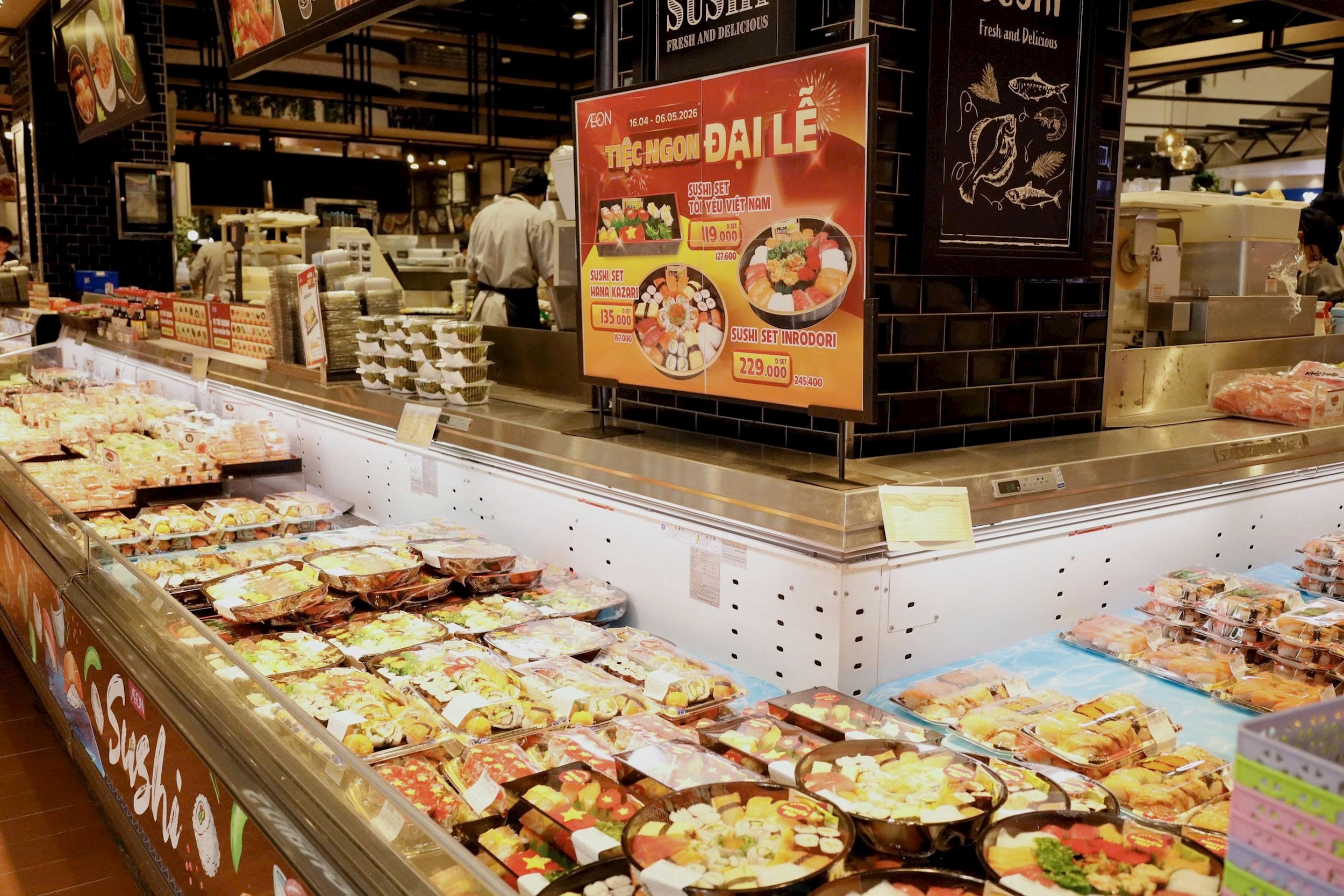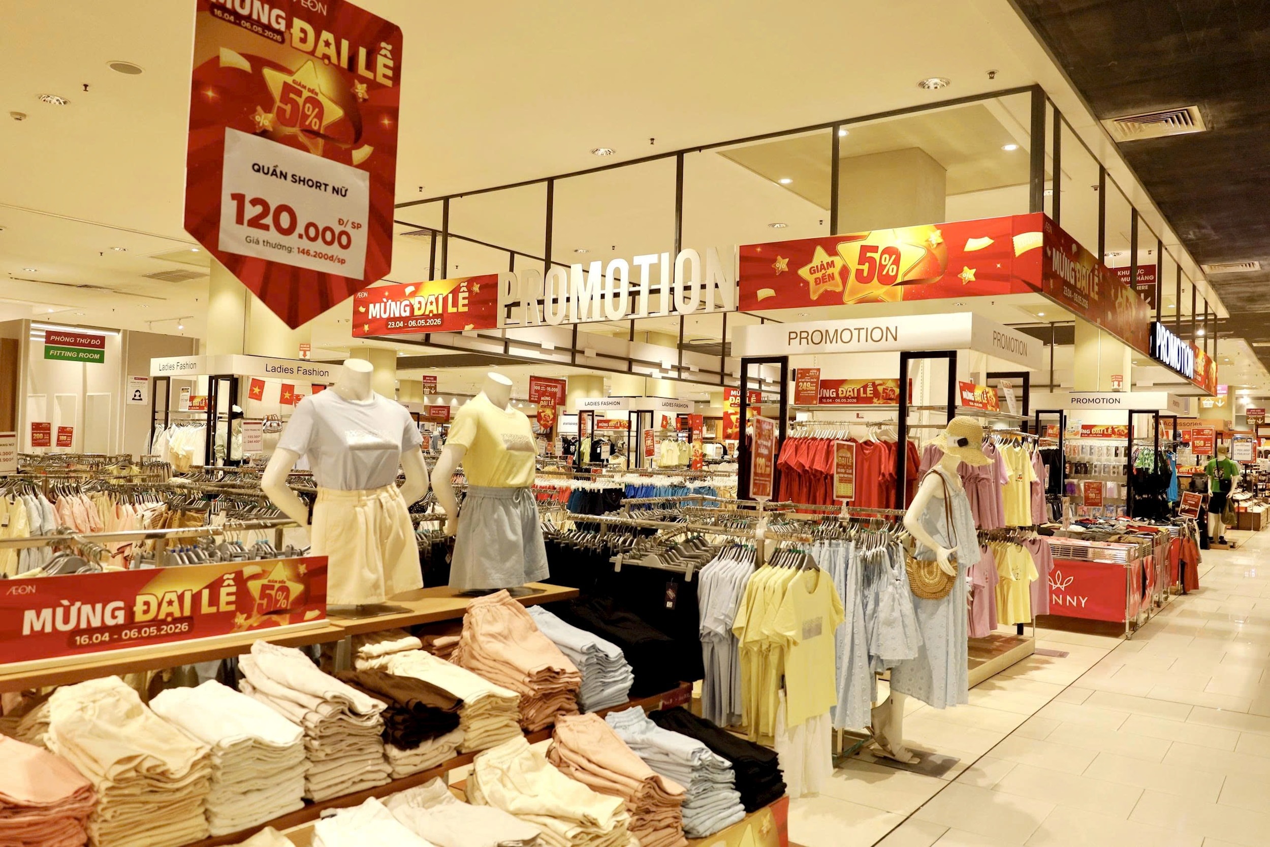 AEON Việt Nam đã chuẩn bị đa dạng từ thực phẩm, đòi uống đến hàng thời trang, gia dụng, với nhiều ưu đãi, đặc biệt là chương trình “Đại lễ săn sale” diễn ra từ ngày 24-4 đến 3-5 tại hệ thống trung tâm bách hoá tổng hợp và siêu thị AEON toàn quốc.