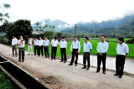 Các đại biểu dự Hội nghị giao ban Chương trình mục tiêu Quốc gia xây dựng NTM quý I-2014 tham qua mô hình đường bê tông nội đồng tại thôn Hát, xã Việt Lâm (Vị Xuyên).