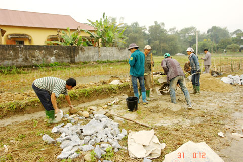 Người dân đội 2, thôn Chung giúp công lẫn nhau khẩn trương bê -tông hóa bờ ruộng sau khi dồn thành thửa ruộng lớn.
