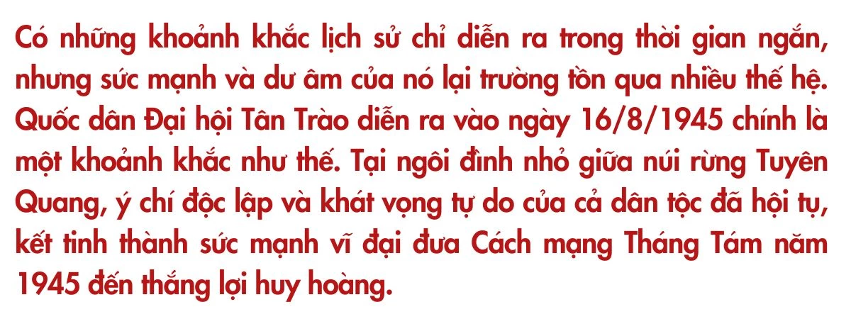 Quốc dân Đại hội Tân Trào năm 1945 không chỉ là một sự kiện lịch sử trọng đại của đất nước, mà là biểu tượng của tinh thần đại đoàn kết toàn dân tộc. Tại đây, những quyết định hệ trọng về vận mệnh đất nước được đặt ra trên nền tảng của ý chí tập thể, khẳng định một nguyên tắc bất di bất dịch: Mọi quyền lực đều thuộc về Nhân dân. Từ Tân Trào, khát vọng độc lập, dân chủ đã lan tỏa như ngọn lửa, thắp sáng con đường giành chính quyền trong Cách mạng Tháng Tám lẫy lừng.