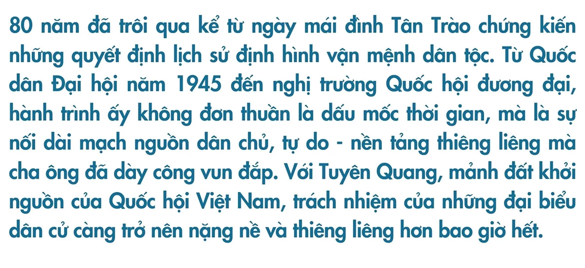 Từ mái đình Tân Trào năm xưa đến nghị trường Quốc hội hôm nay, tinh thần dân chủ luôn là mạch nguồn xuyên suốt trong hoạt động của cơ quan đại biểu dân cử. Nếu Quốc dân Đại hội Tân Trào là hình mẫu điển hình của nền dân chủ thực chất, thì hôm nay, Quốc hội và Đoàn ĐBQH Tuyên Quang phải tiếp tục kế thừa và phát huy tinh thần ấy bằng những hành động cụ thể, thiết thực.