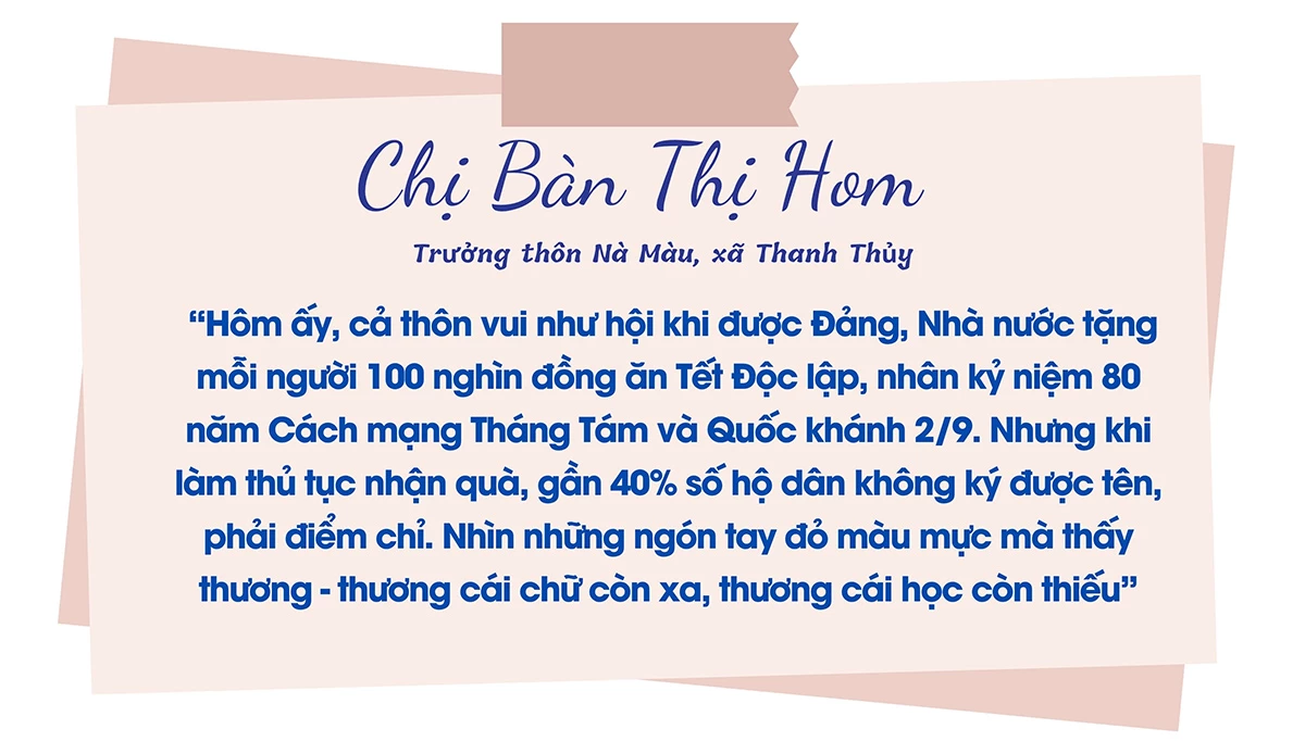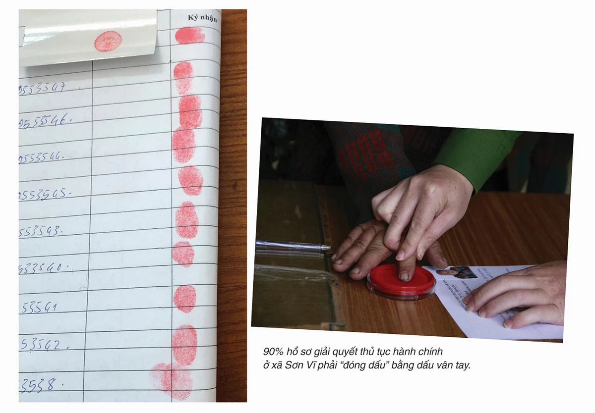 Trung bình mỗi ngày, xã Sơn Vĩ giải quyết 50 thủ tục hành chính cho người dân, nhưng có tới 90% hồ sơ buộc phải “đóng dấu” bằng dấu vân tay.Không chỉ riêng thôn Khai Hoang, tại thôn Nà Màu, xã Thanh Thủy, câu chuyện điểm chỉ vẫn là nỗi day dứt chưa nguôi trong ký ức của nhiều người. Toàn thôn có 77 hộ với 402 nhân khẩu, 100% là đồng bào Dao.
