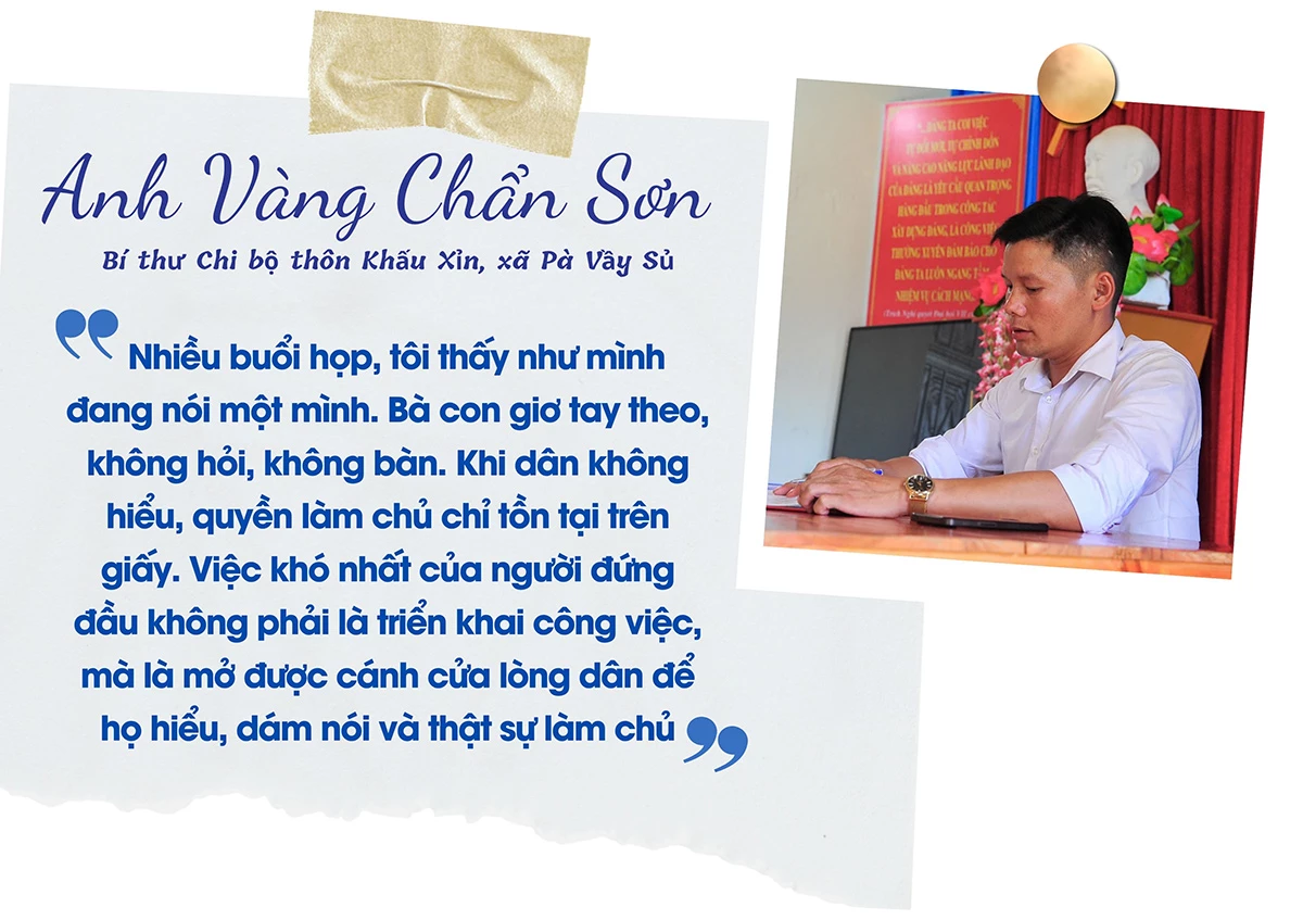Thôn biên giới Khấu Xỉn có 79 hộ, 100% là đồng bào Mông, trong đó 63,3% là hộ nghèo. Nhiều người không biết chữ, nói tiếng phổ thông chưa sõi; đi họp thôn chỉ để “có mặt cho đủ”. Không ít cuộc họp, quyết sách được thông qua trong im lặng mà “ý dân” vẫn là khoảng trống chưa được lấp đầy.
