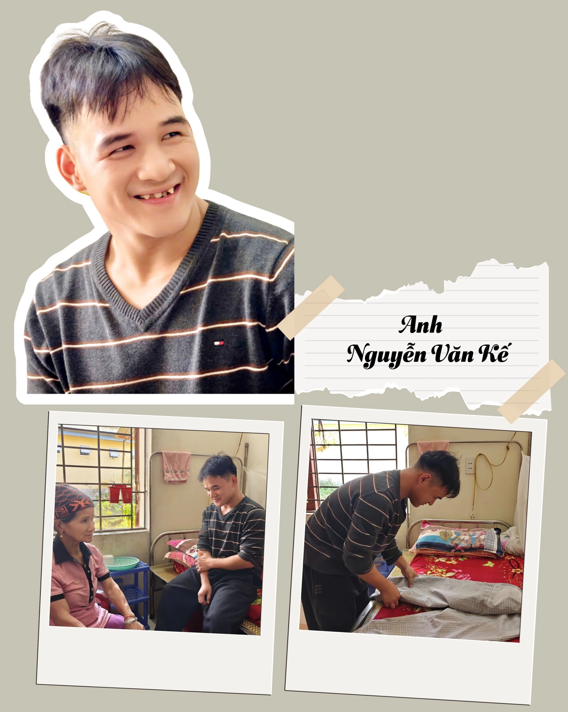Khi đi đến chỗ của đối tượng Nguyễn Văn Kế, một chàng trai 22 tuổi với hồ sơ bệnh án là đối tượng khuyết tật đặc biệt nặng về vận động, nghe và nói, chúng tôi thấy Kế đang đứng gấp quần áo với sự khéo léo, linh hoạt không khác người bình thường. Nhận ra sự khó hiểu của chúng tôi chị Ngân không giấu nổi niềm tự hào, chị chia sẻ, ngày bé đôi chân của Kế bị khuyết tật nặng cùng hình thái chân vòng kiềng không thể tự đi lại, em cũng mắc chứng khó nghe và không thể nói như người bình thường, nhưng các cán bộ ở đây đã nỗ lực giúp em điều trị, đi đến nhiều bệnh viện khác nhau để hôm nay em có thể đi trên đôi chân của chính mình. Tuy phát âm khó khăn nhưng chúng tôi vẫn nghe ra được Kế đang kể về việc mình được chăm sóc tận tình ở trung tâm, được sống với mẹ (mẹ của Kế cũng là đối tượng bảo trợ tại trung tâm) và ước mơ sau này em có thể tự học nghề và tìm một người bạn đời.