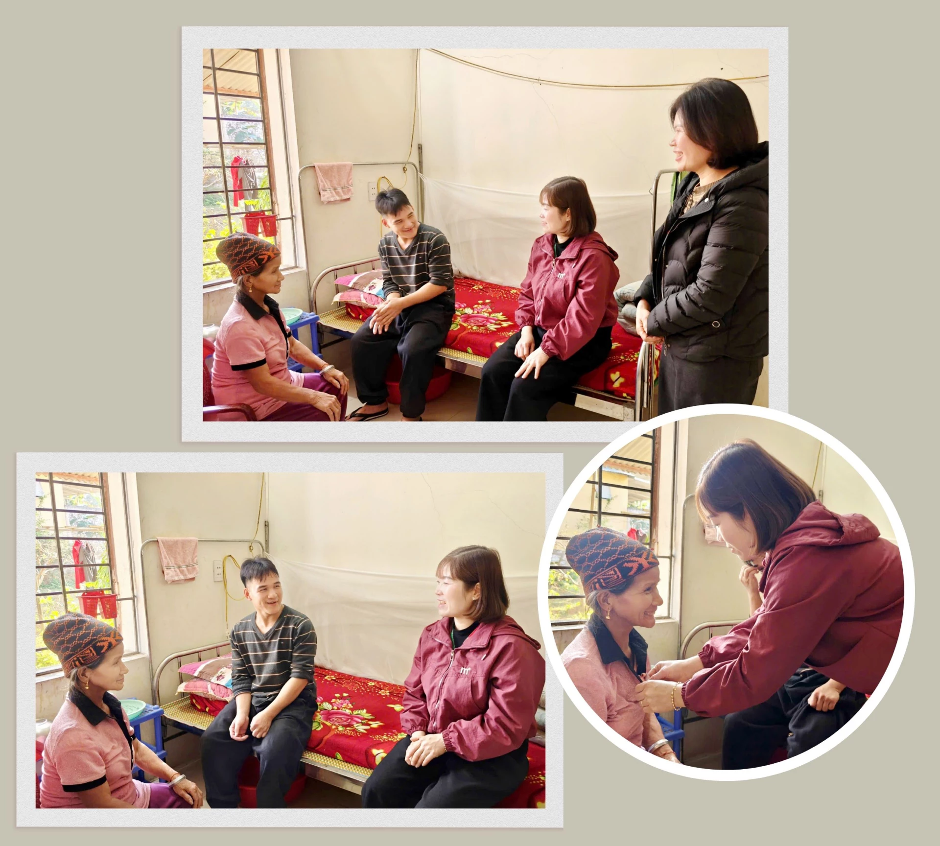 Đi đến từng giường chị kể cho chúng tôi nghe về hoàn cảnh, nếp sinh hoạt của đối tượng. Đối tượng Vừ Mí Tủa, dân tộc Mông, Tủa bị mù và kèm theo các biểu hiện về thần kinh. Ở trung tâm đã lâu, các cán bộ đều biết Tủa thích ngủ, nếu gọi dậy không đúng lúc sẽ nói rất nhiều và đôi khi là quát tháo các cán bộ ở đây. Tủa chỉ nói bằng tiếng Mông, nhưng vẫn có thể nghe hiểu tiếng phổ thông nếu nhận ra đó là giọng của cán bộ chăm sóc mình. Còn với đối tượng Nguyễn Văn Tuyên vừa đi viện về, là người khuyết tật đặc biệt nặng nhưng cứ gặp cán bộ đến hỏi thăm là lại cười vui vẻ. Có lẽ nỗi đau về tinh thần, thể xác đã được cán cán bộ ở đây sưởi ấm nên ông Tuyên mới có thể cười tươi đến vậy.