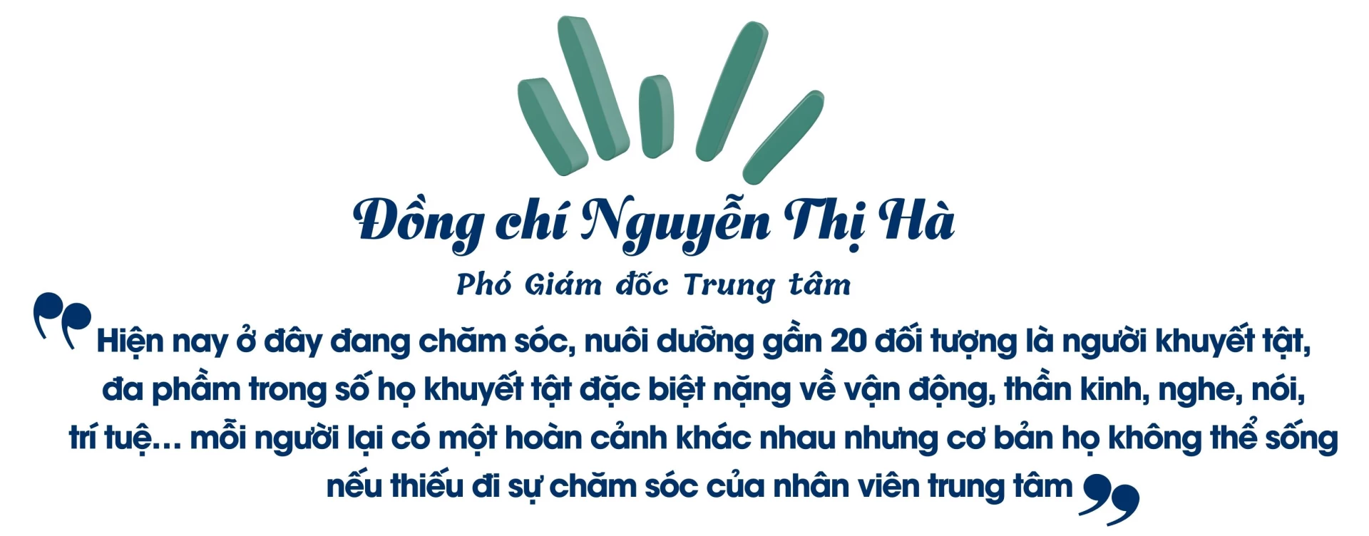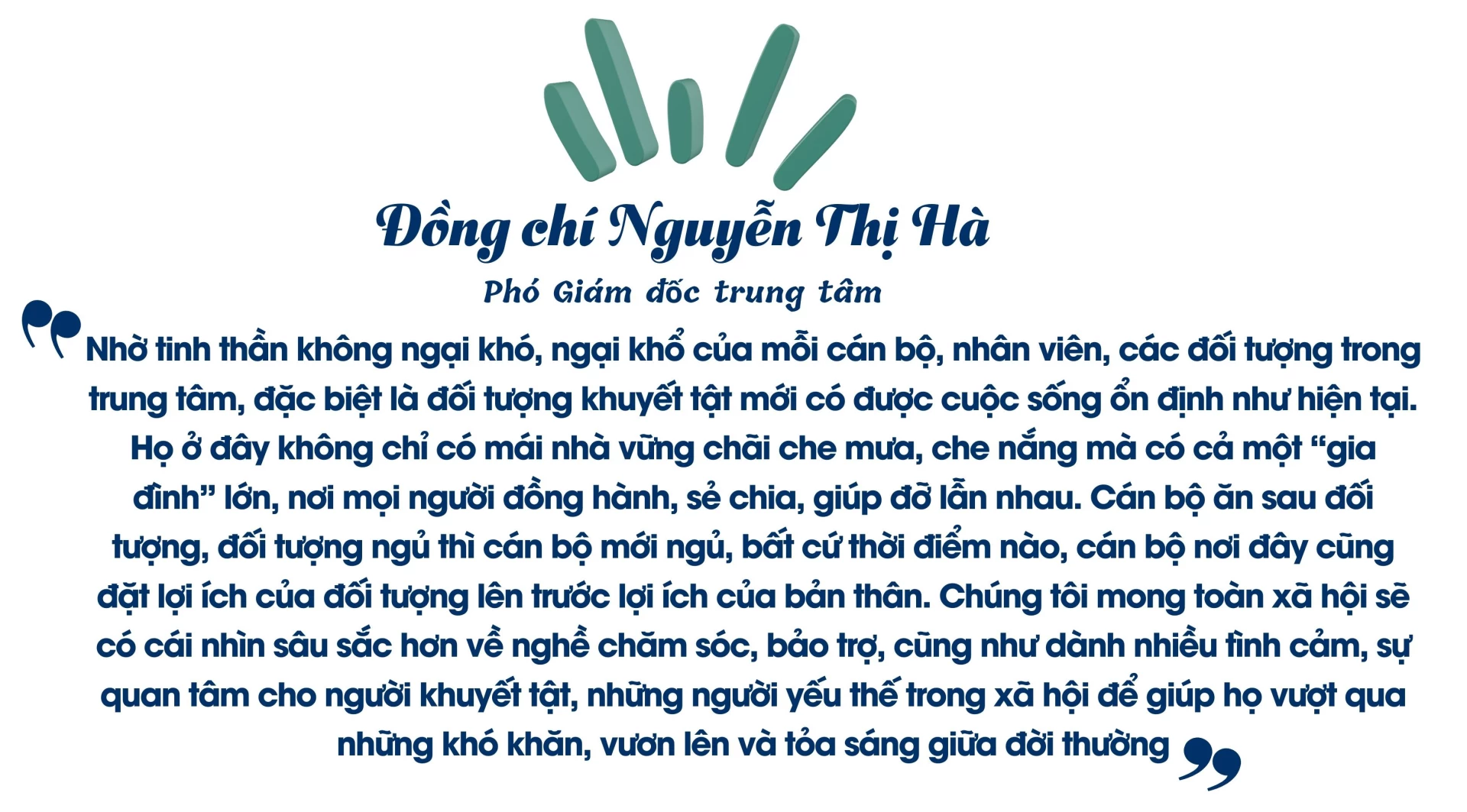Các cán bộ ở Trung tâm Công tác xã hội Hà Giang không coi việc ở đơn vị là việc cơ quan mà họ coi đó là việc nhà, các đối tượng ở trung tâm là những người thân trong gia đình, bởi nếu không có tình thân ấy thì những đối tượng khuyết tật ở nơi đây không thể được chăm sóc chu đáo và nhận được sự quan tâm nhiều đến vậy.