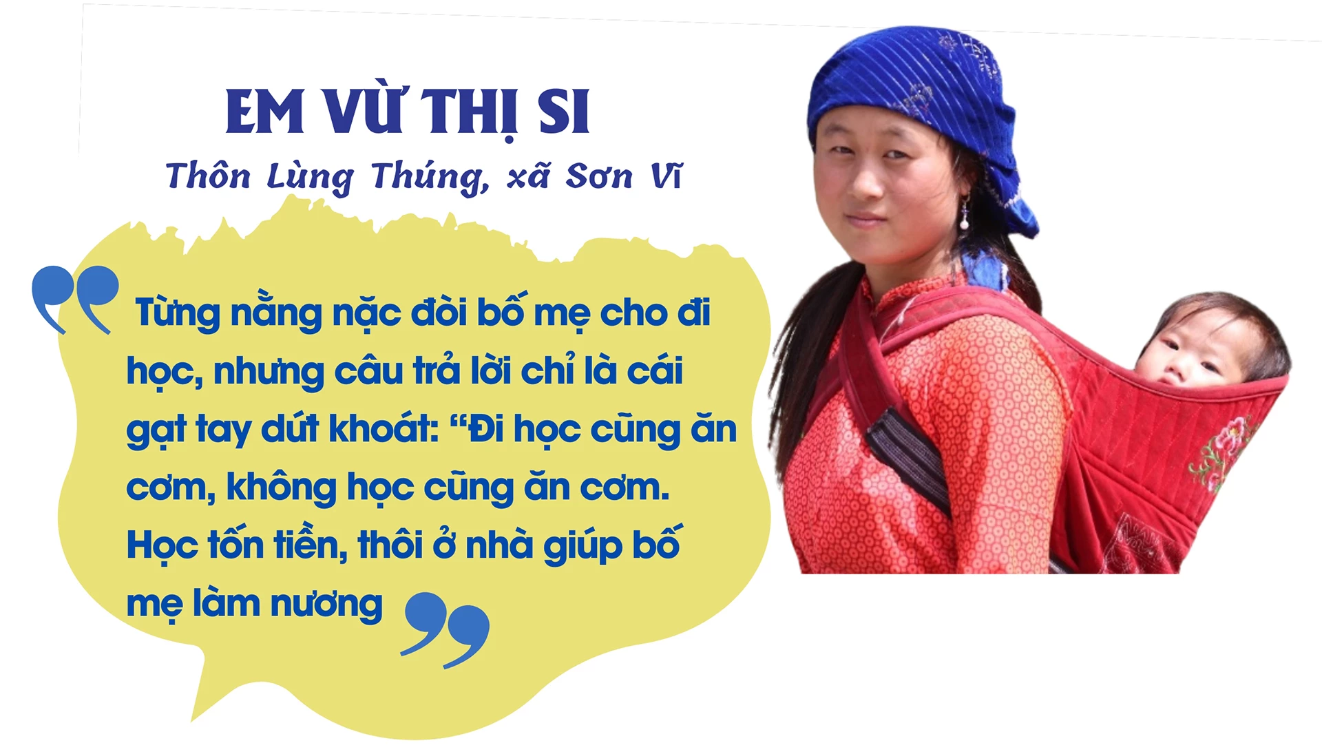 Câu trả lời ngắn ngủi, lạc lõng giữa lời chào thân thiện ấy như một nhát cắt vào lòng, để rồi qua lời phiên dịch của thầy giáo Vũ Minh Đức, Trường Phổ thông dân tộc bán trú Tiểu học Thượng Phùng, chúng tôi mới vỡ ra câu chuyện buồn nơi biên viễn. Ở tuổi 17, cuộc đời Vừ Thị Si rẽ sang ngã khác khi theo chồng về chung một nhà. Giờ đây, ở tuổi xuân 24, Si đã là mẹ của 4 đứa con thơ. Si chưa từng một ngày cắp sách tới trường, không biết chữ, tiếng Việt cũng trở nên xa lạ. Chồng của Si là anh Thò Mí Lừ – học dở dang lớp 6 rồi cũng bỏ giữa chừng, đi làm thuê kiếm tiền nuôi gia đình. Cả nhà quẩn quanh trong vòng tròn khép kín của tảo hôn, mù chữ và đói nghèo