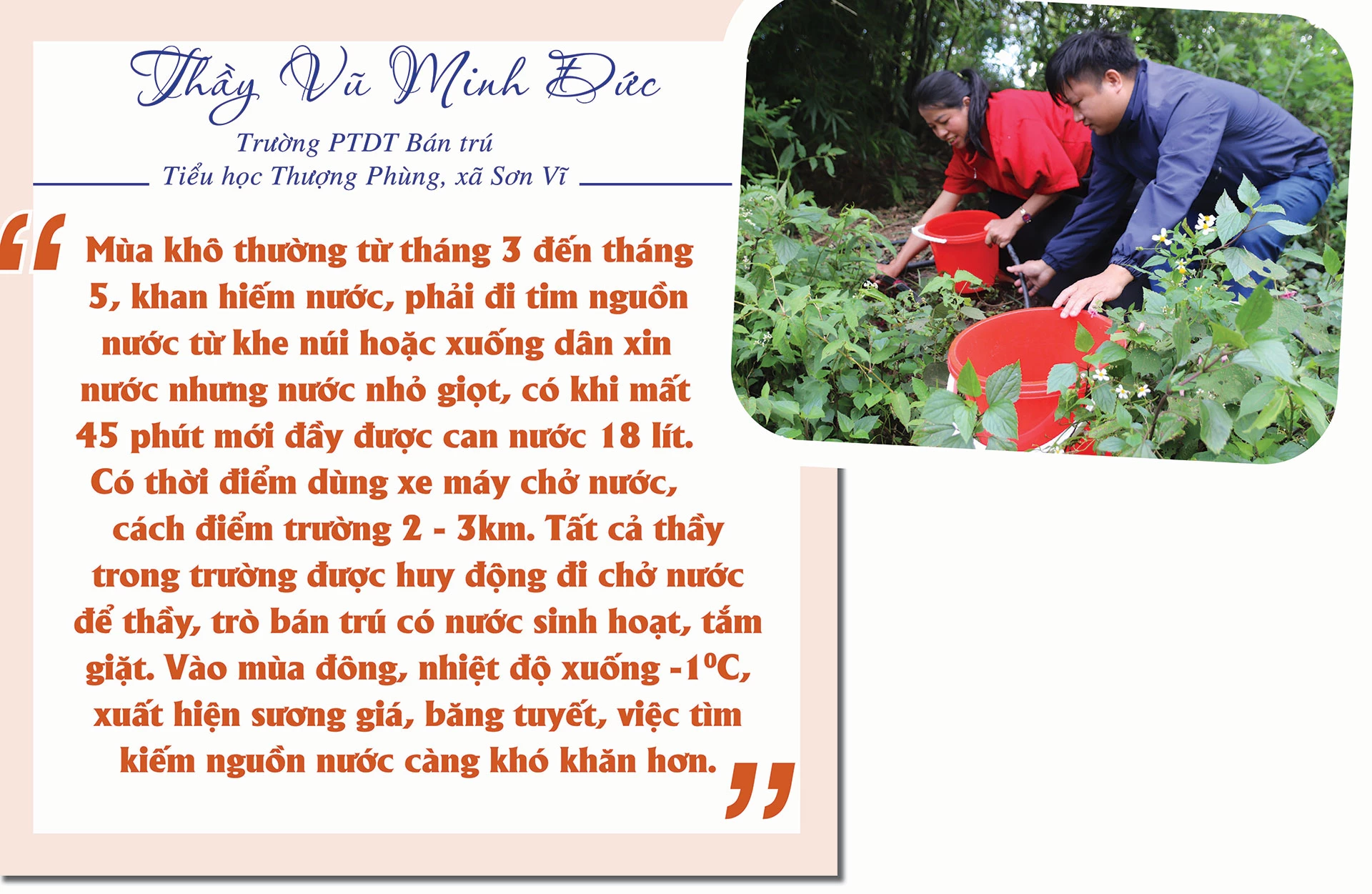 Cô Hoàng Thị Duyên, giáo viên trẻ ở điểm trường Thàn Chư, xã Sơn Vĩ quê tận xã Tát Ngà, cách điểm trường 50km, nên cô chọn ở luôn điểm trường để thuận lợi trong việc giảng dạy. Mỗi chuyến đi về điểm trường với cô là hành trình vượt dốc, có khi ngã xe, có khi phải xin củ sắn ăn thay cơm vì đường xa hết gạo; phải học tiếng Mông để dạy chữ cho trẻ em nghèo. Nhưng những khó khăn ấy cô dễ dàng vượt qua, chỉ có việc phải vượt đèo, vượt núi lên đầu nguồn lấy nước về sinh hoạt trong mùa khô là những tháng ngày khiến cô nhớ mãi. Cô Duyên nhớ lại: "Để có nước sinh hoạt, hằng ngày, bà con và giáo viên phải dậy từ 3-4 giờ sáng, đi bộ, leo núi vài ki-lô-mét về phía đầu nguồn để địu nước về sử dụng. Có hôm sức khỏe yếu, không thể đi lấy nước được, thì phải mất tiền mua nước, hoặc thuê người đi lấy, nước sạch là nỗi ám ảnh trong mùa khô nơi đây".