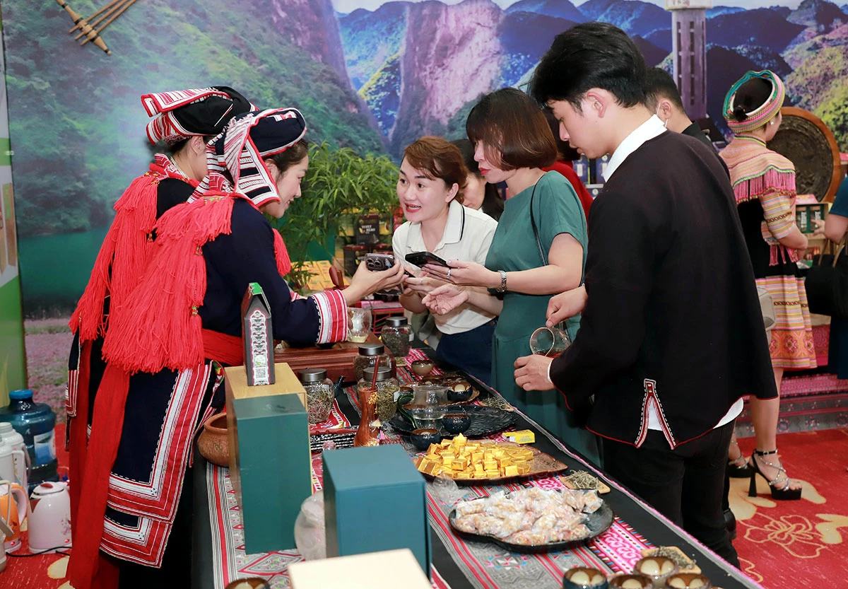 | Du khách tìm hiểu thông tin và thưởng trà tại Gian hàng giới thiệu sản phẩm Fìn Hò Trà. |
