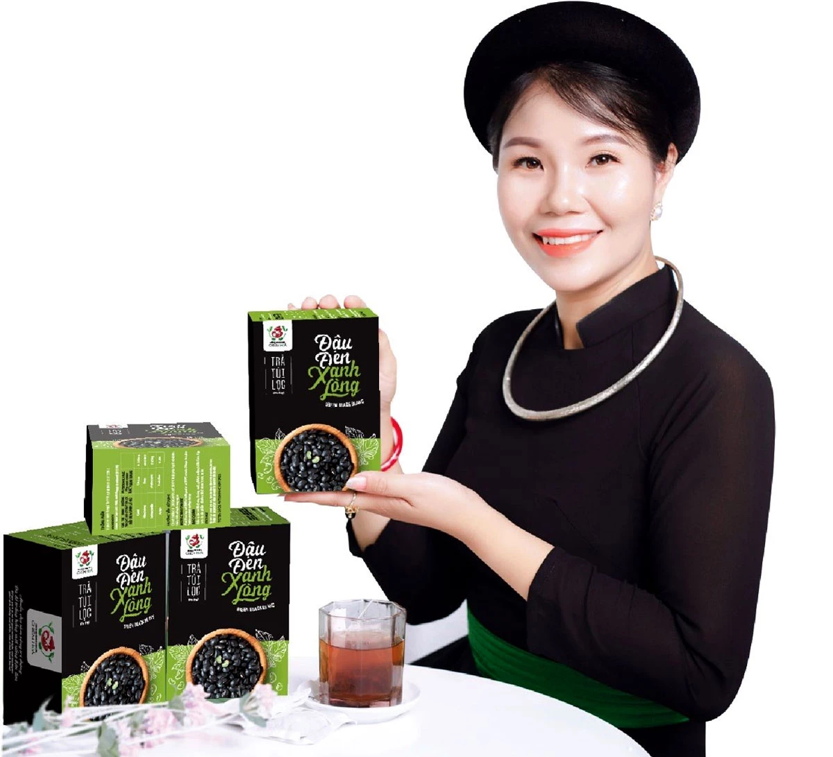 | Chị Phạm Thị Hồng, Giám đốc HTX Nông nghiệp hữu cơ Hồng Phát xã Kim Bình, giới thiệu sản phẩm Trà đậu đen xanh long. |