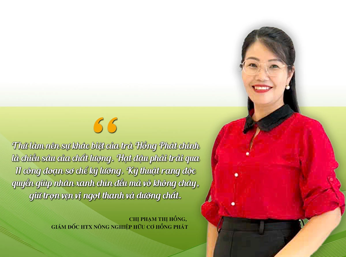 Chị Hồng nhớ lại: "Từ vài chục cân đậu và chiếc chảo rang thủ công, tôi miệt mài thử nghiệm suốt 2 năm trời, nếm trải nhiều thất bại. Và "trái ngọt" đã đến vào tháng 5-2020, khi sản phẩm trà túi lọc kết hợp đậu đen xanh lòng và hà thủ ô đỏ chính thức ra đời. Thứ làm nên sự khác biệt của trà Hồng Phát chính là chiều sâu của chất lượng. Hạt đậu phải trải qua 11 công đoạn sơ chế kỹ lưỡng. Kỹ thuật rang độc quyền giúp nhân xanh chín đều mà vỏ không cháy, giữ trọn vẹn vị ngọt thanh và dưỡng chất”.