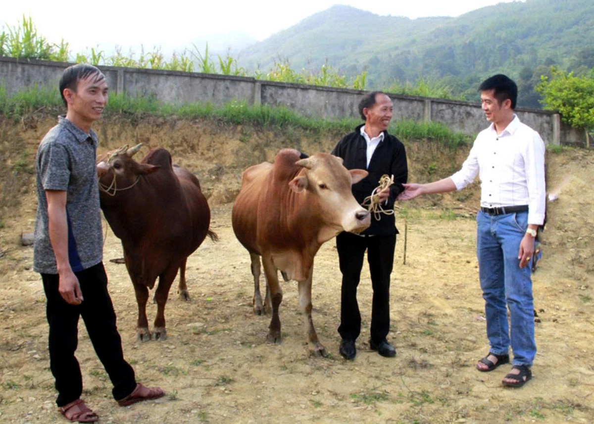 | Giám đốc Hợp tác xã Cát Lý Thượng Thái Cát trao bò liên kết chăn nuôi cho người dân xã Thuận Hòa. |