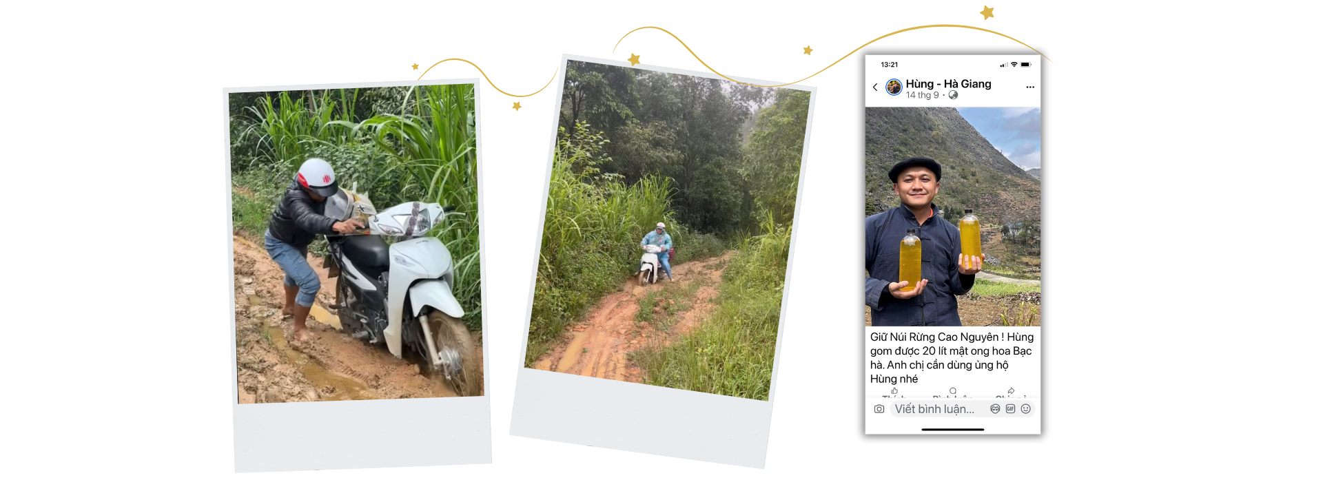 | Hùng đi tuyên truyền qua đoạn đường đất bùn lầy và Hùng bán mật ong cho bà con vùng cao trên trang cá nhân Facebook. |