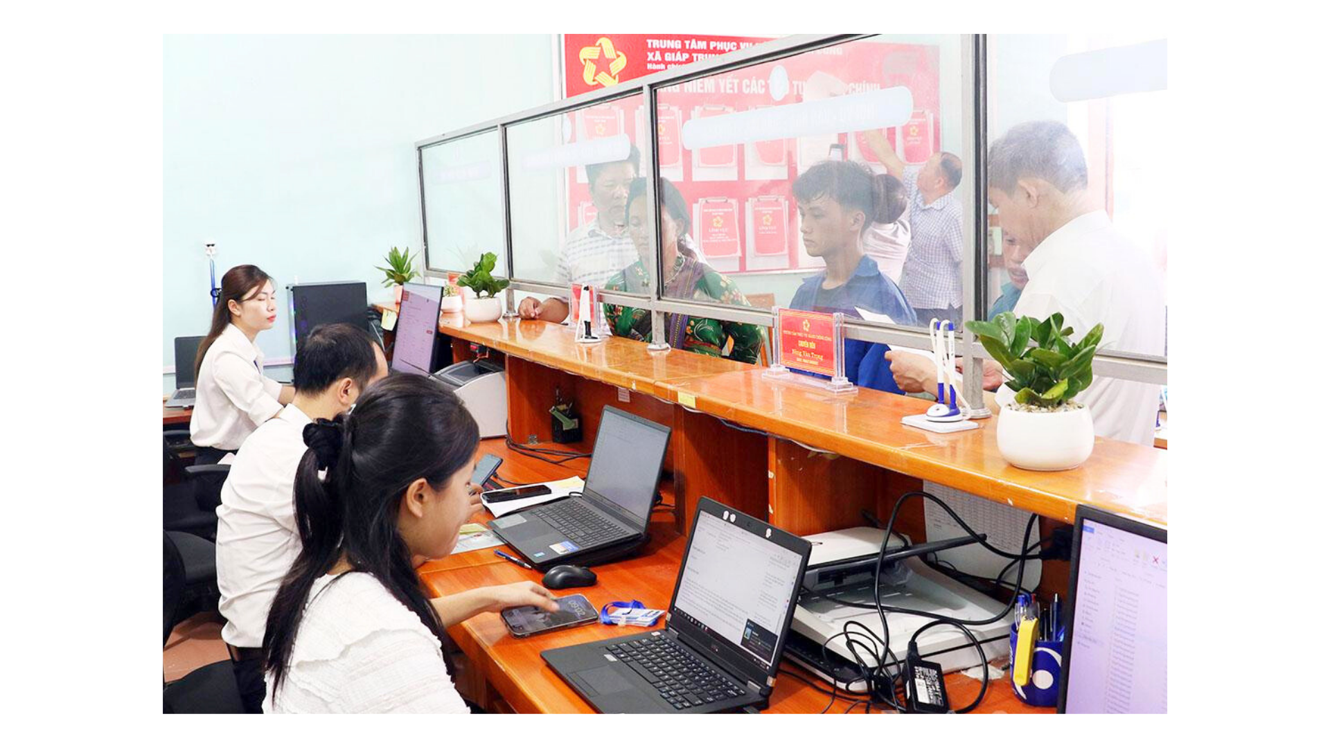 | Cán bộ Trung tâm phục vụ hành chính công xã Giáp Trung ứng dụng CNTT để giải quyết thủ tục hành chính cho người dân. |