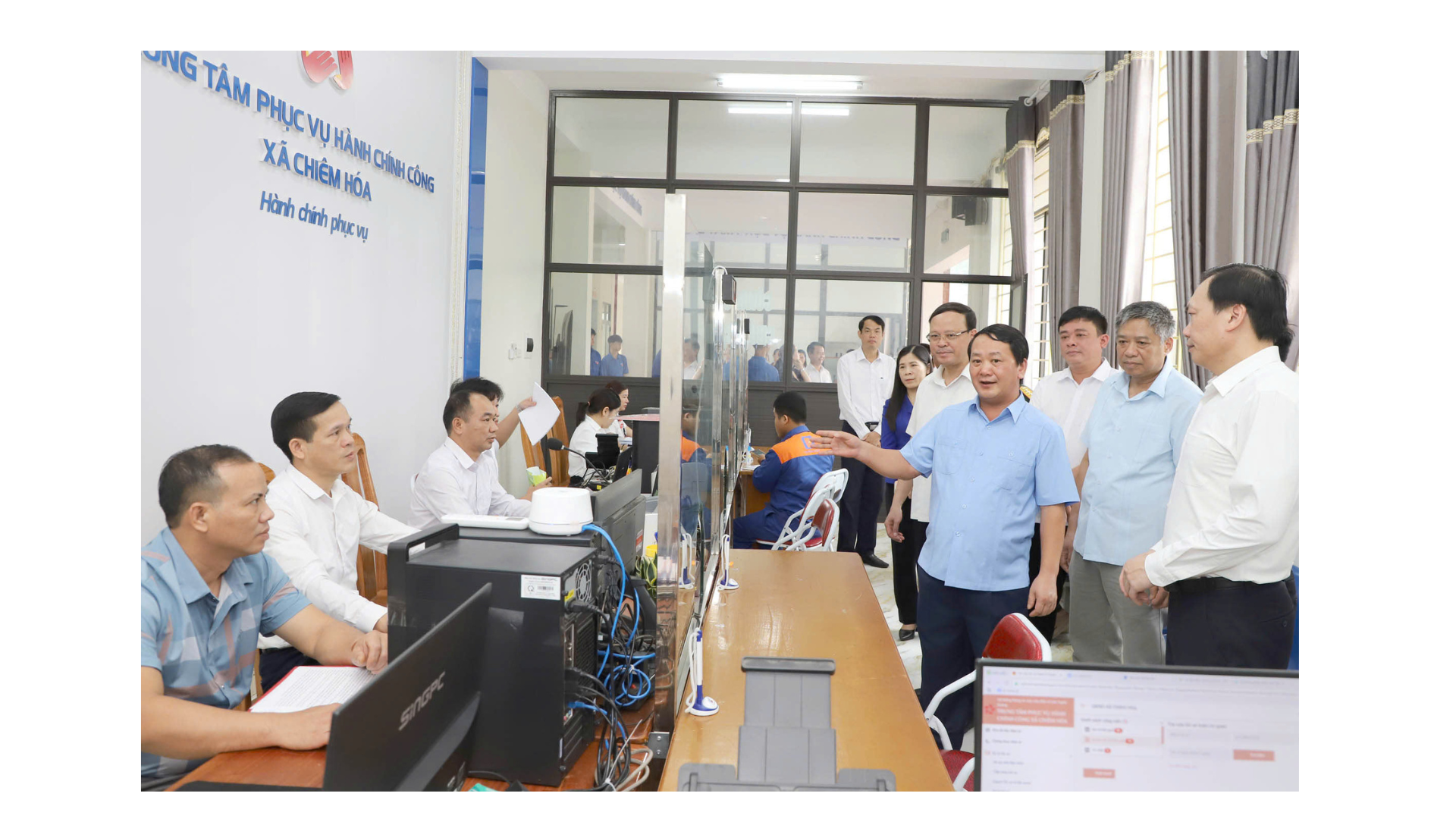 | Đồng chí Bí thư Tỉnh ủy Hầu A Lềnh kiểm tra hoạt động của Trung tâm phục vụ hành chính công xã Chiêm Hóa. |